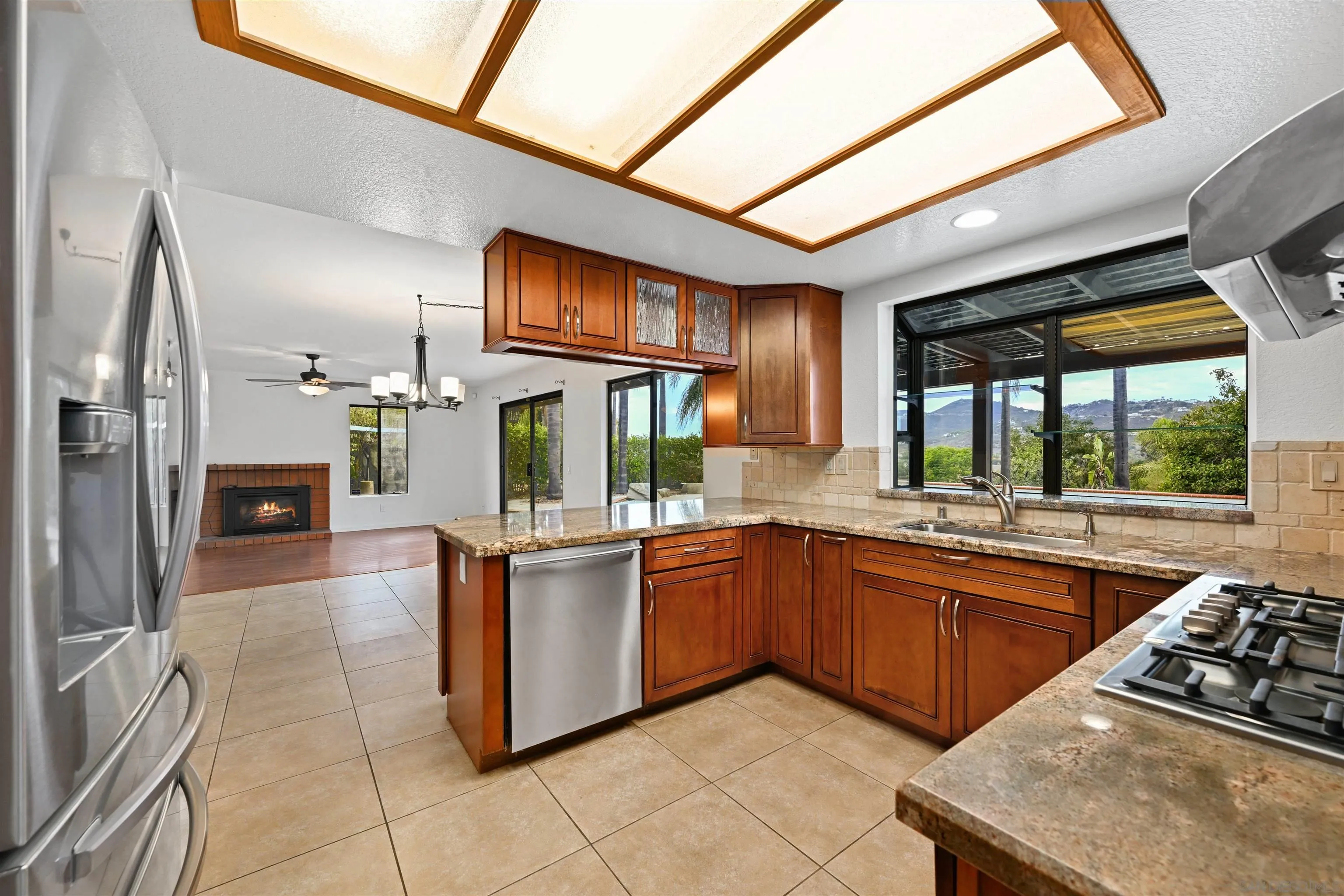 Private View Estate With Resort Amenities! Amazing views and total privacy await at the end of a peaceful cul-de-sac. This beautifully remodeled home is filled with upgrades and thoughtful details throughout. The property boasts a sparkling pool and spa, heated by either an owned solar system or a Jandy gas heater, surrounded by lush tropical landscaping. The gourmet kitchen features custom cabinetry, stainless steel appliances, and granite countertops, opening to a comfortable family room with a Heat & Glo fireplace. Vaulted ceilings in the living room & dining room add spacious elegance. Updated bathrooms showcase granite counters and modern finishes. Enjoy flexible living with a bedroom and full bath conveniently located on the main level. All bedrooms feature ceiling fans for year-round comfort. As an added bonus the kitchen and bathrooms have been fully-remodeled. The first-floor laundry room includes cabinetry and a sink. A whole-house water softener and reverse osmosis system provide pure, softened water throughout. The home includes a fully-monitored security system with live camera. The 3-car garage offers ample space, with one bay currently used as a workshop—easy to convert back if desired. Outdoor living is enhanced by over 35 mature palm trees and a large patio ideal for entertaining. Grab your favorite beverage and take in the west-facing views delivering breathtaking sunsets. With nearby access to the new Palomar Hospital, shopping, dining, and freeways, this home combines rural tranquility with modern convenience.
