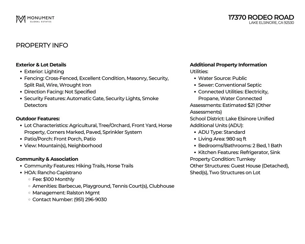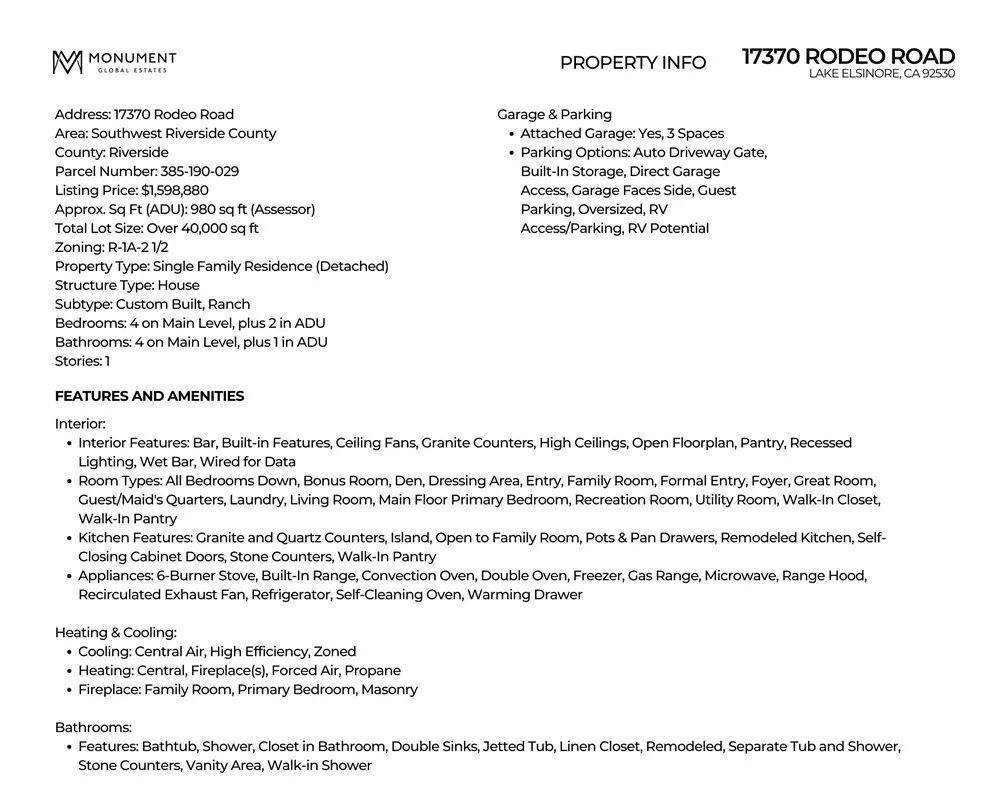 Welcome to 17370 Rodeo Road, a stunning ranch estate home nestled in the exclusive gated equestrian community of Rancho Capistrano near Rancho Mission Viejo. This brand-new luxury residence spans approximately 4750 sqft, plus a 650 sqft attached garage, and is set on a sprawling 2.3-acre lot. The open floor plan includes a separate dining room, family room, and great room with a modern fireplace and a vast wet bar, perfect for entertaining. The gourmet kitchen is a chef's dream, featuring granite countertops, open shelves, a commercial-grade Bertazzoni dual fuel stove, a large double farm sink, a custom island with a built-in microwave oven/convection oven and warming drawer, ample storage, and a walk-in pantry. The luxurious master suite boasts a gas fireplace, French doors with vineyard views, two large walk-in closets, and an elegant bathroom with double sinks, a jacuzzi tub, and a spacious walk-in shower. Three additional oversized bedrooms and three bathrooms provide ample space for family and guests. The expansive outdoor space offers endless possibilities, from building your dream equestrian facilities to creating organic gardens. Enjoy community and mountain horse trails, hiking, biking, and other outdoor adventures right at your doorstep. The location is ideal for equestrian enthusiasts, being strategically situated between two top AA-rated equestrian horse show grounds. Modern conveniences include super high-speed internet, wireless connectivity throughout, and smart home features. Additionally, the property includes a grandfathered-in, updated 975 sqft detached A