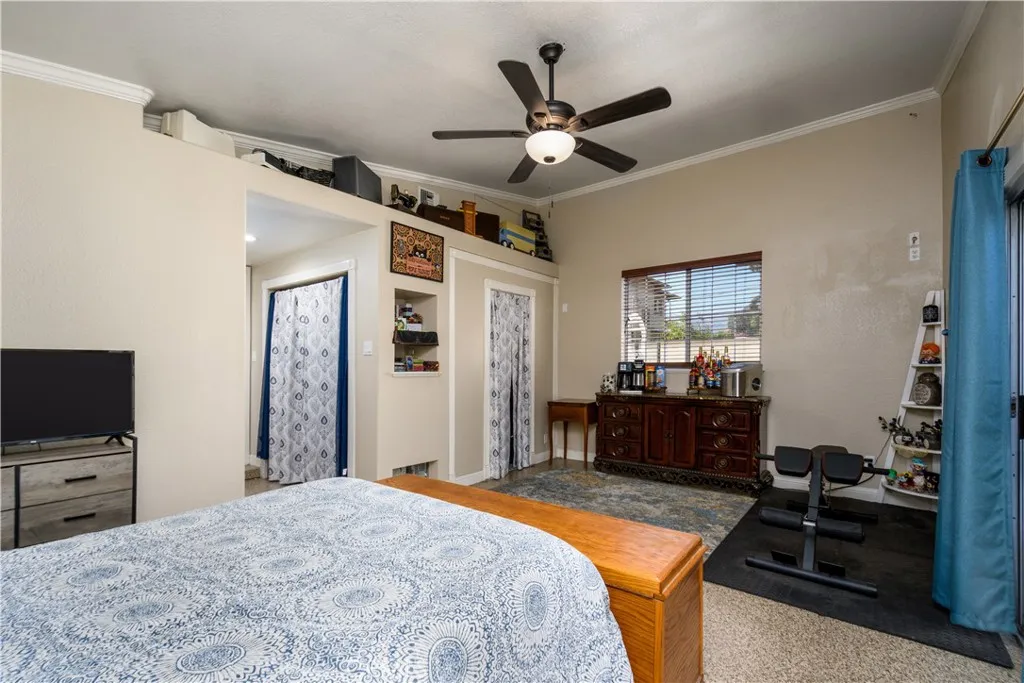 Welcome to this spacious 5-bedroom,3.5 bath home located in a desirable Upland neighborhood. Offering 2,358 sq ft of living space, this property is ideal for multi-generational living with a flexible layout featuring 3 separate living areas. Interior highlights include a double-sided fireplace, crown molding, recessed lighting, ceiling fans throughout, and 5 sliding glass doors that bring in natural light and provide easy access to the outdoor space. The Kitchen is well equipped with double ovens, pantry, granite counter tops, lots of cabinets and a lazy Susan! The backyard features low Maintenace artificial turf, covered patio with recessed lighting and fans perfect for entertaining. The detached 2 car garage with alley access includes a workshop area, abundant built in cabinetry and a 1/4 bath. Don't miss this opportunity to make this well maintained and versatile home you own!
