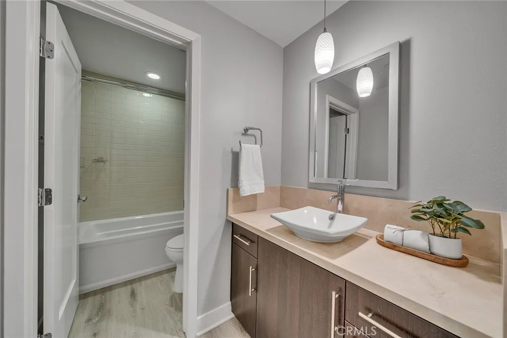 Welcome to the epitome of modern luxury living in Central Park West, Irvine. It is better than model homes.Nestled in the highly sought-after Chelsea neighborhood, this spectacular "loft-inspired" home offers a lifestyle beyond compare. Boasting 3 bedrooms and 3 full baths, this residence is a testament to spacious and contemporary living, featuring upgraded flooring throughout. As you enter the main level, you're greeted with a private space, complete with a stylish ensuite bath, making it an ideal guest bedroom or a perfect spot for a home office. The modern staircase leads you to the second-level living area, where chic design meets ultimate functionality. The abundance of natural light flooding this space is a defining feature, illuminating every corner of this beautiful home. The heart of this residence is the fabulous kitchen, which is adorned with rich cabinetry, a generous island with seating, granite countertops, and high-end Viking appliances. The large dining area seamlessly flows into the stunning main living space, where a statement fireplace and glistening sliders invite you to the private deck/patio, offering breathtaking views of the community pool and other outdoor amenities. For moments of relaxation, retreat to the expansive main bedroom suite with an exquisite ensuite bath that carries forward the elegant dark cabinetry, granite counters, and a glass shower. A spacious walk-in closet provides ample storage. A delightful second guest room and a sophisticated full bath complete the second-level living space, ensuring comfort and functionality. Immerse your