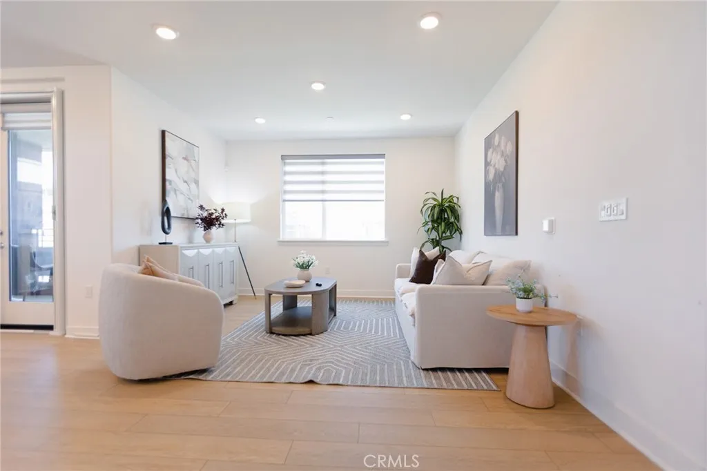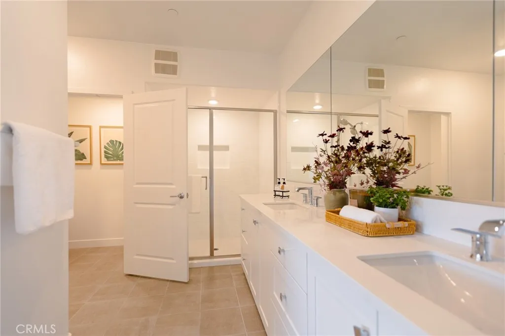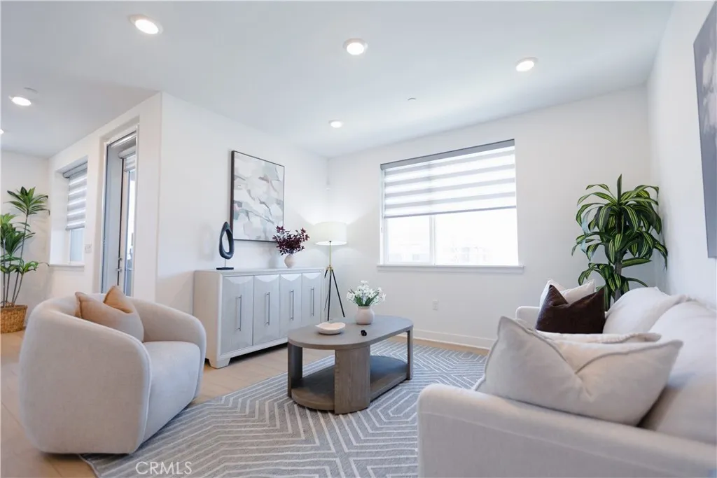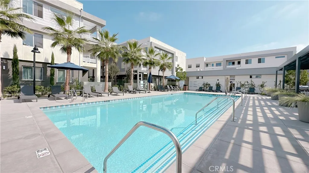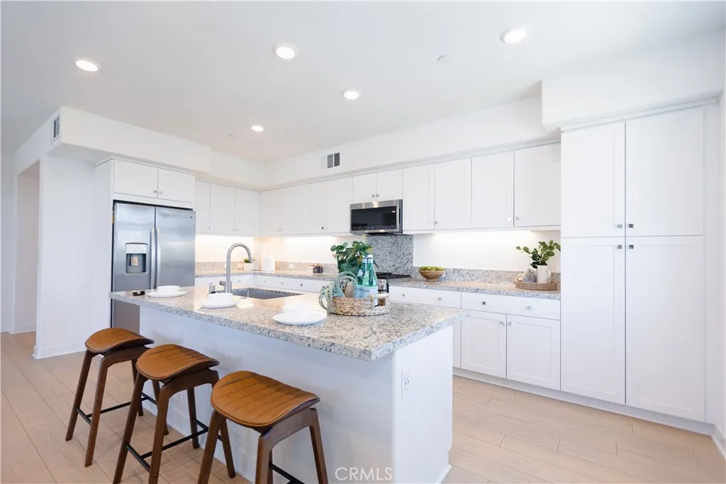 Upscale living in this gorgeous Alia Model 3 flat located in the heart of Anaheims Platinum Triangle. Secured building with key fob access, elevator and a private, enclosed two-car garage for parking and storage. Step inside this sought-after, open concept floor plan and appreciate the great room which includes a kitchen with white shaker cabinets, stainless steel appliances, granite counters, a dining area and a living room. Beyond the living room is a slider that leads to a private balcony. The primary bedroom includes an ensuite bathroom with a dual sink vanity, a step-in shower with glass enclosure and a walk-in closet. Laundry room means the washer & dryer located in the unit! Garage is tandem and located at end of building (you do not have to enter parking court like other units). Garage side door leads to building hallway with elevator (or if you prefer, stair) access. The association amenities include a pool, spa, outdoor BBQ area and park like areas, including a tot lot. This best of urban and suburban living includes walking trails nearby Angels Stadium, the Honda Center, Disneyland, unique eateries, shops and restaurants and award-winning UCI Medical Center.