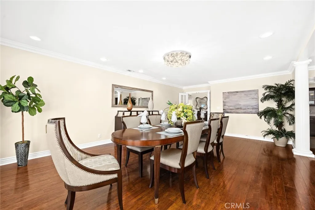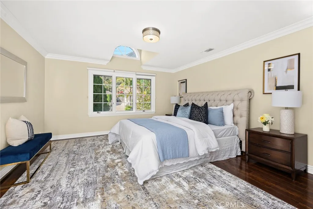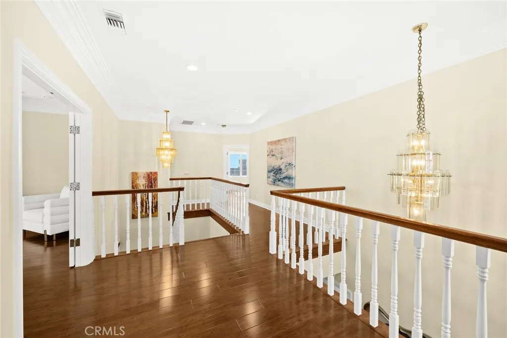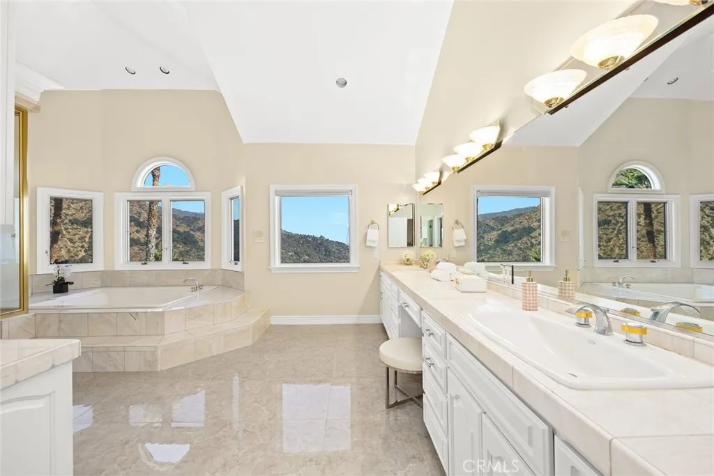 This spectacular view home, nestled in Arcadia's highly desirable Highland Oaks neighborhood, is part of the prestigious Arcadia School District and exemplifies Southern California living with expansive panoramic views of the gardens, mountains and city lights. Situated on a hilltop, this beautifully updated estate offers the perfect combination of serenity, breathtaking views and privacy. As you approach the home you're welcomed by a meticulously landscaped front yard and a paved circular driveway leading to an elegant entry. The artistry of marble inlay flooring graces the entry and living room, which seamlessly integrates indoor and outdoor spaces through walls of glass windows framing the stunning landscapes. The bright family room, with views of the pool and canyon, opens onto a large outdoor patio, perfect for entertaining. Anchored by two gas fireplaces, one in the living room and another in the family room, this home exudes warmth and comfort. The formal dining room and breakfast room, both featuring walls of glass, continue showcasing gorgeous scenic canyon views. Additional features include a large recreation room and beautiful wood floors throughout the living areas, enhancing the home's natural charm. Originally built in 1959 then rebuilt in 1991, this expansive 6,103 sq. ft. estate offers 8 bedrooms, 7.5 bathrooms, with 5 en-suite bedrooms upstairs and 1 en-suite downstairs. The primary suite elevates luxury with a fireplace, direct access to a sun-deck patio, two large walk-in closets, and a spa-like bathroom with a soaking tub offering incredible canyon views