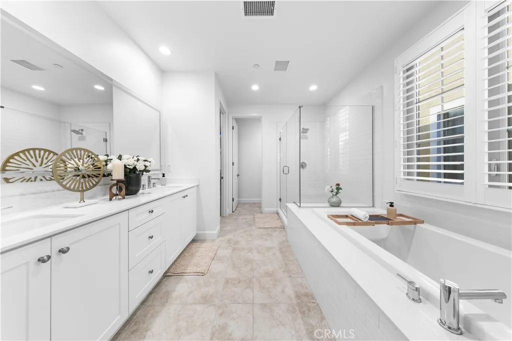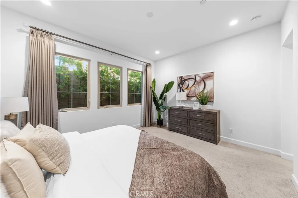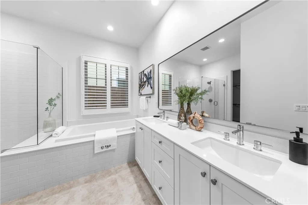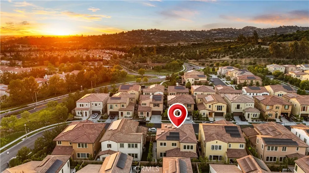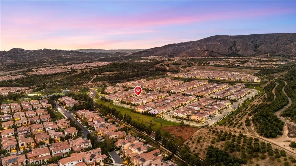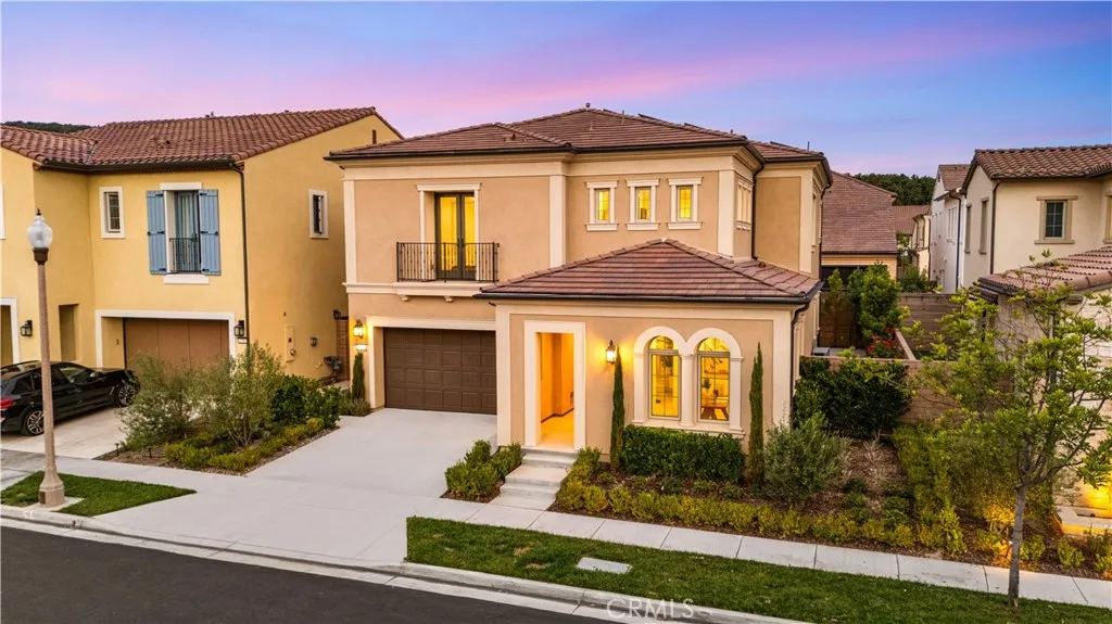 In the prestigious guard-gated community of Orchard Hills in Irvine, this elegant residence offers refined living with unmatched convenience and luxuries. Surrounded by acres of lush greenery, palm-lined views, and breathtaking mountain scenery, Orchard Hills provides a serene, family-friendly atmosphere alongside resort-style amenities, including a Junior Olympic pool, wading pool, spa, tennis and basketball courts, picnic areas, club room, and year-round community events. Top-rated schools, parks, and scenic trails further enhance the appeal of this highly coveted neighborhood. Inside, the home features thoughtful design and modern luxury. Beyond the welcoming foyer, a versatile flex space offers the perfect setting for a home office or guest room. The chef's kitchen boasts a timeless white palette, complete with stainless steel appliances, a chic backsplash, and a walk-in pantry. Expansive windows fill the open living and dining areas with natural light, while seamless access to the private yard makes entertaining effortless. White plantation shutters and recessed lighting accentuate the homes bright, sophisticated style. Upstairs, a cozy loft provides additional living space. The primary suite is a tranquil retreat with a walk-in closet and a spa-inspired bath featuring dual vanities, a soaking tub, and an oversized glass shower. Two secondary bedrooms share a connected bath with another soaking tub and separate shower, while an additional bedroom offers its own Juliet balcony. In total, the home includes three soaking tubs and thoughtfully designed secondary spacesincl