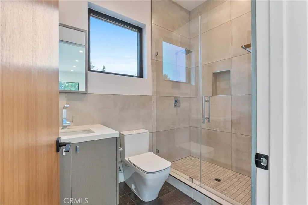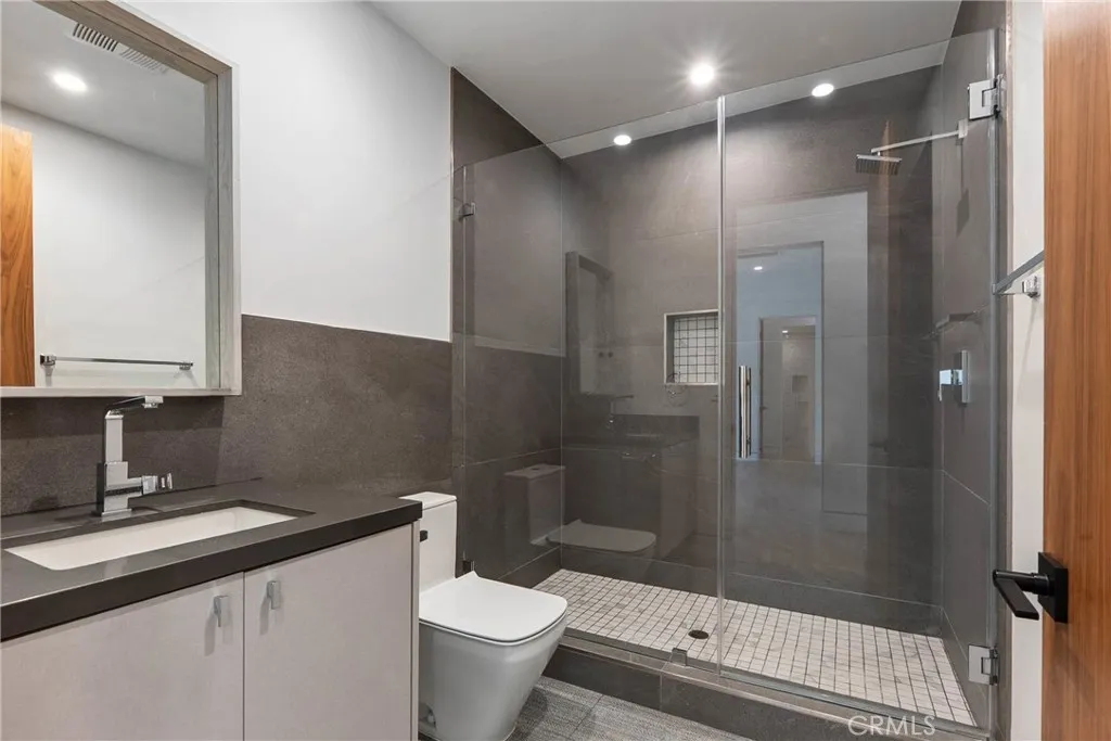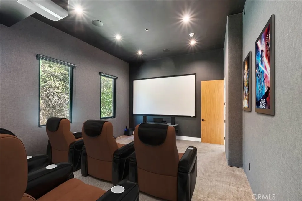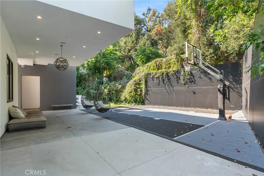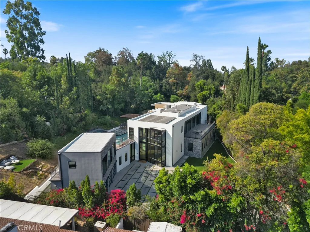 Welcome to your private sanctuary, nestled on a sprawling .68 acre wooded lot. Situated on a flag lot, this estate sits far from the street, ensuring unmatched privacy. A gated entrance and extended driveway lead to a spacious three car garage, with ample additional parking for guests. Step through the breathtaking glass entryway, where soaring 32-foot ceilings, a dramatic chandelier, and striking white oak floating stairs set the stage for this architectural masterpiece. Walls of glass and Fleetwood sliding doors seamlessly blend indoor and outdoor living, flooding the space with natural light and creating an entertainers dream. The open concept layout is anchored by stunning oak floors and a sophisticated Italian designed kitchen, featuring a hidden oversized pantry and a wine fridge, perfectly positioned beside an elegant formal dining area. The lower level boasts two ensuite bedrooms, a private office, and a state-of-the-art theater, ensuring ultimate comfort and convenience. Upstairs, the primary suite is a true retreat, complete with a cozy fireplace, a custom walk-in closet, and a spa inspired bath. A private sitting area and relaxation patio offer a peaceful escape. Above the garage, a versatile space awaits, ideal for a gym, studio, or guest quarters, opening onto a spacious outdoor terrace. Step outside into an entertainers paradise, featuring a zero edge saltwater pool and spa, a sleek cabana, a fully equipped pool house, and a basketball court. Multiple outdoor patios provide the perfect setting for dining and relaxation, while paid-for solar panels add a modern
