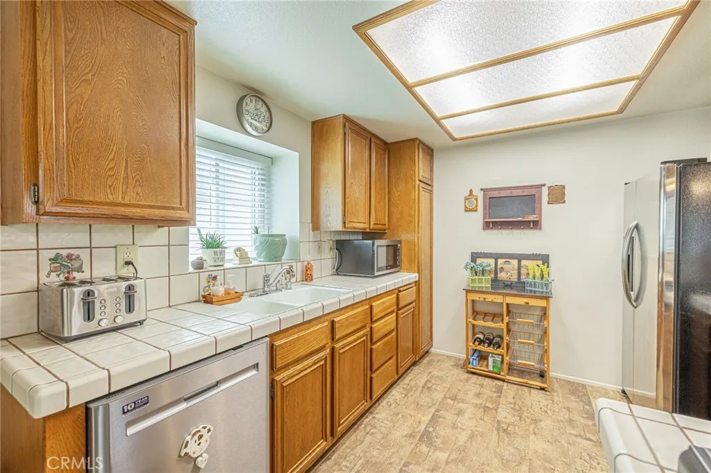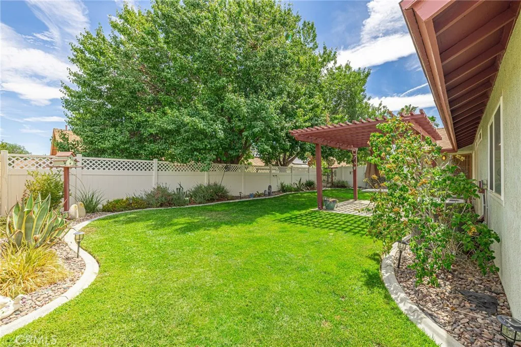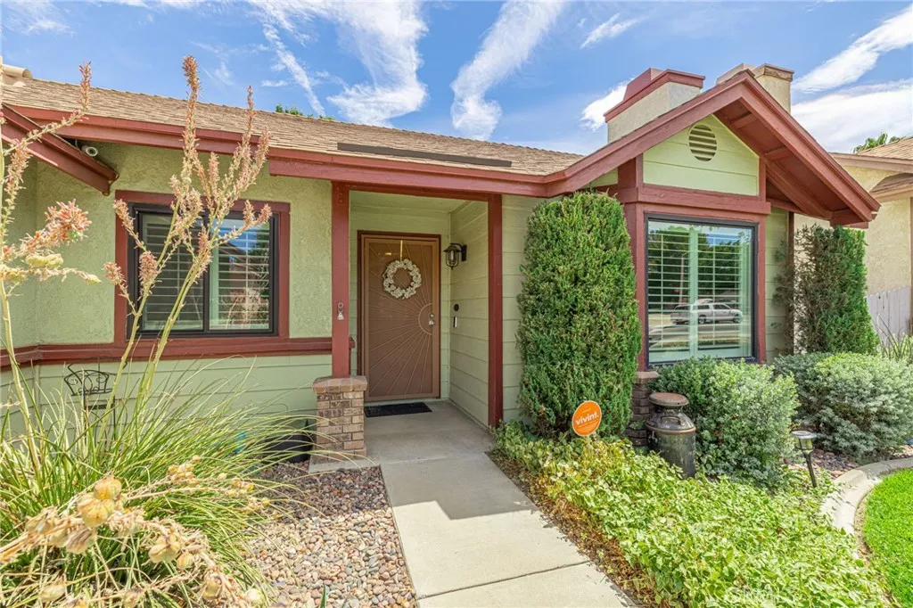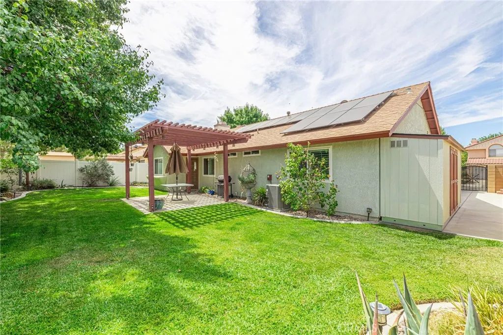 This inviting Harris Home single-story ranch, built in 1989, features three bedrooms, two bathrooms with the primary bathroom beautifully renovated tiled-shower. This home has 1,372 square feet. Enjoy vaulted ceilings, a cozy fireplace, beautiful wood look plank tile flooring, window shutters, over head lighting with fans, pastel colored interior painting, upgraded kitchen, tile counter tops, stainless appliances, indoor laundry, the rear yard space has pergola patio cover with new vinyl fencing, mature landscaping, a storage shed, finished 2 car garage, and solar upgrades on a prime lot-freshly repainted exterior with your own Tuff Shed and move-in-ready this home is near shopping, schools and freeway.