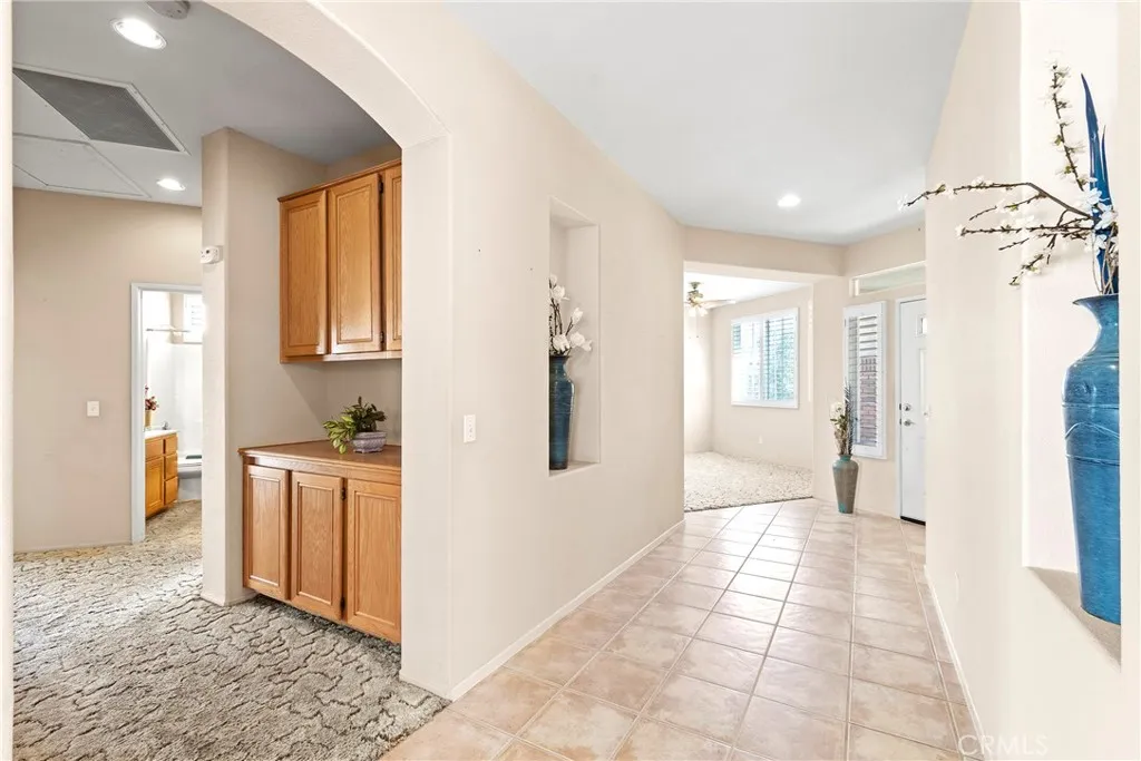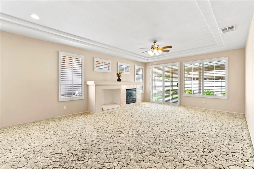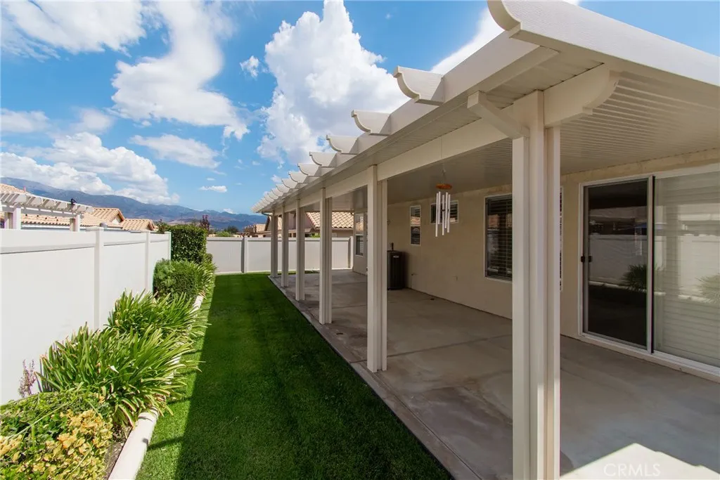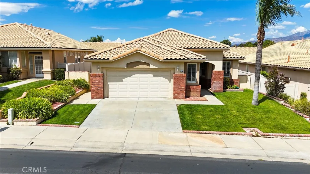 PRICED TO SELL 'FORSYTHIA' Model (SINGLE LEVEL 2 BR + 2 BA + Office/Den - 1,668 Sq Ft) with NEWER HVAC. Brick Enhanced Exterior with Nice Curbside Appeal - Enter the Home to a Dedicated Foyer Interior Entry with Decorator Cut Outs - a Den/Office is to the left of the Entry, and Arched Doorways lead to a Great Room. The Great room is Light and Bright, with Plantation Shutters, Coffered Ceilings, a Cozy Fireplace, and Sliding Doors to the Patio/Yard Area. The Kitchen is Open, with SS Appliances, including Refrigerator. Laundry Room is off Kitchen - Washer, Dryer & Refrigerator are all included in the Price. The yard is Fully Fenced with a new Alumawood Patio Cover running the length of the Home, and there's a lovely view of the San Gorgonio Mountains over the fence ....... Sun Lakes Country Club goes beyond just a place to live - It's a vibrant community designed to keep you Active & Engaged, offering: TWO 18-HOLE GOLF COURSES with 2 Pro Shops, THREE Clubhouses, TWO Restaurants, Bar & Lounge, Tennis, PICKLE BALL COURTS, Pools (Including Large Indoor Pool), Jacuzzi Spas, THREE Fitness Centers & Fabulous Planned Activities Offered on a Daily Basis. There are 80+ Social CLUBS, including: Dancing, RV Club, Yoga, Table Tennis, Cards, Bocce Ball, Bowling, Car Club, Drama/Theatre Club, Sewing, Tennis, Knitting, Bingo, Travel, Quilters, Art League, International Culture, Genealogical Society, Garden, Photography, Travel, and a lot MORE .... If that's not Enough, Add TRIPS AND TRAVEL EXCURSIONS scheduled all year long. Association Dues INCLUDE CABLE TV & INTERNET - The community is Lo