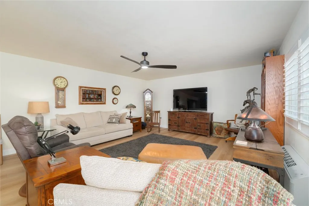 VIEWS! VIEWS! VIEWS! The first thing you will see when you enter this home is PANORAMIC views of Saddleback Mountain, green belts and amazing city lights. Located near gate 10, this home has been beautifully updated and is move in ready. Updates include newer wide plank luxury vinyl flooring in the living room, dining room, kitchen and baths, dual pain windows and plantation shutters throughout. The kitchen blends style and functionality. Boasting a breakfast nook with views of mountains and beautiful sunsets. Newer appliances and quartz counter tops with subway tile back splash that extends to the ceiling. A large pantry that will hold all your extra appliance and much more. Recessed lighting with bead board and decorative trim ads to the style and charm. The expansive living room/dining room has stylish lighting and ceiling fan, 2 sliding glass doors that lead to a lovely, tiled deck that showcases those beautiful views of Saddleback Mountains, green belts and amazing city lights. The primary suite also has panoramic views, plush carpeting, plantation shutters, ceiling fan, 2 large closets, a mirrored dressing area with updated cabinetry, quarts counter tops, designer sink with black hardware and ship lap details. There is a bathtub with white subway tile surround. The guest bath has also been completely updated with a glass shower, newer cabinets, lighting and quartz counter. All 3 bedrooms have their own heat & A/C units. This Garden Villa building is located within walking distance to club house 5 & 6 and includes subterranean parking with private storage, a great mult