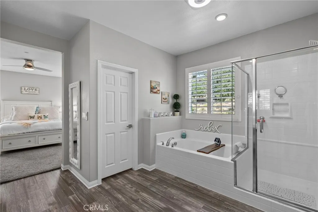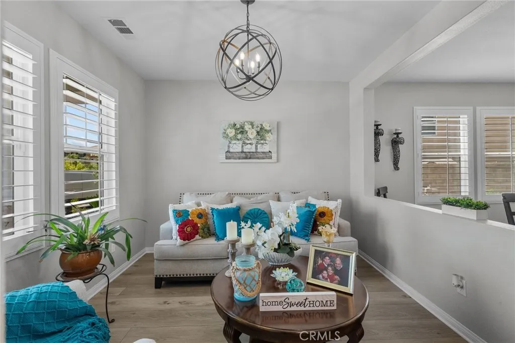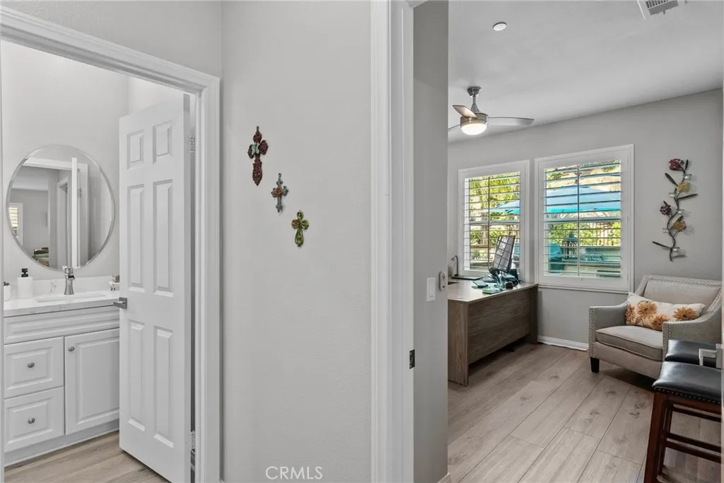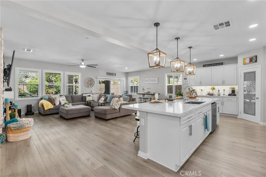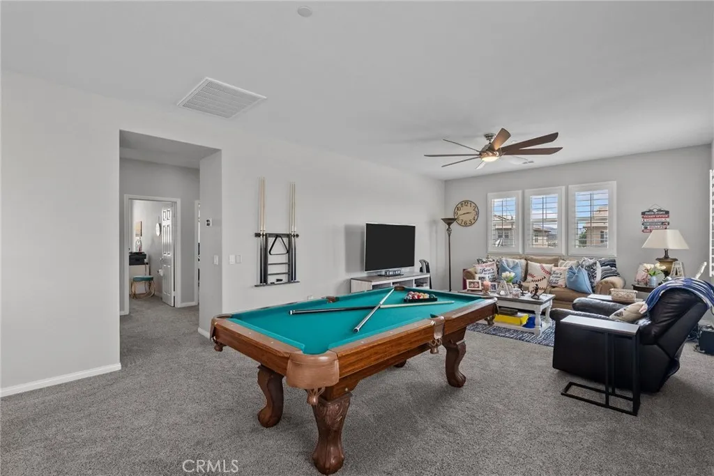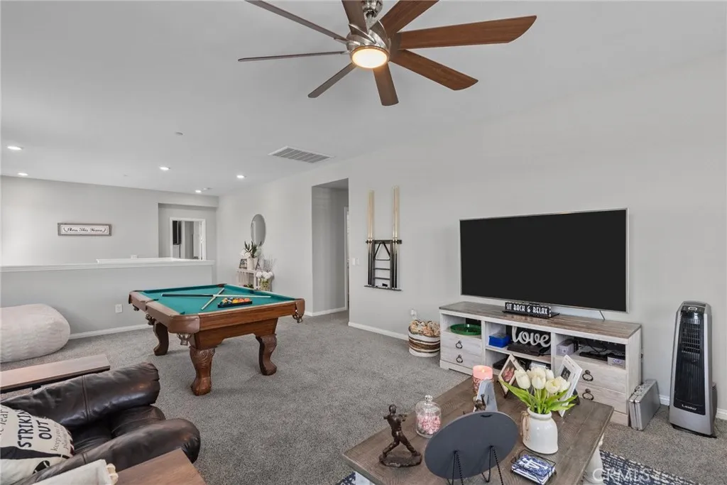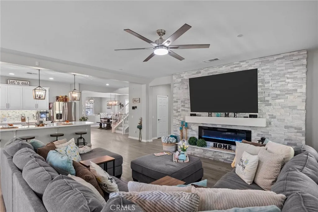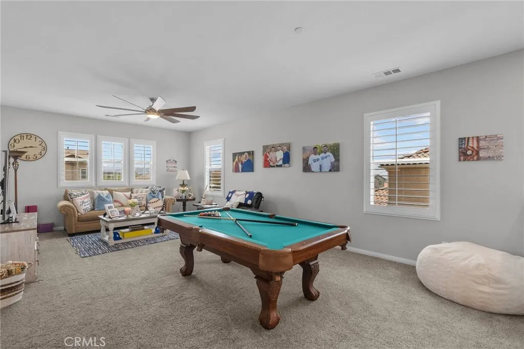 Welcome to this desirable home in the Plum Canyon Community with NO MELLO ROOS & LOW HOA. This stunning home offers an ideal blend of elegance and functionality. You are greeted by a spacious front yard and a beautifully designed open floorplan upon entry. The main level features a convenient bedroom and full bath, perfect for guests or private office space. The living room features a custom built-in entertainment center, complete with a rock wall and electric fireplace for cozy evenings. The updated kitchen boasts new quartz countertops, backsplash, and hardware, along with a massive center island with a breakfast bar and oversized sink. The main level also features a custom dry bar with its very own wine fridge. Upstairs, a sprawling loft provides additional versatile living space. The primary suite boasts a giant walk-in closet that will exceed your expectations. Another bedroom upstairs also includes its own full bathroom and walk-in closet, ensuring comfort and privacy for all. Additional interior upgrades include new flooring downstairs, plush carpeting upstairs, fresh paint throughout, custom shutters throughout, new fans in all bedrooms and loft, and new lighting fixtures throughout the main level. Outside, enjoy the benefits of a covered patio with ceiling fans, perfect for outdoor gatherings. The built-in outdoor kitchen is a chefs dream, equipped with a BBQ, sink, stovetop, bar top, and fridge. The backyard also includes a fountain, custom stone/brick masonry work throughout, and a tucked-away shed for added storage and convenience. Additional highlights include
