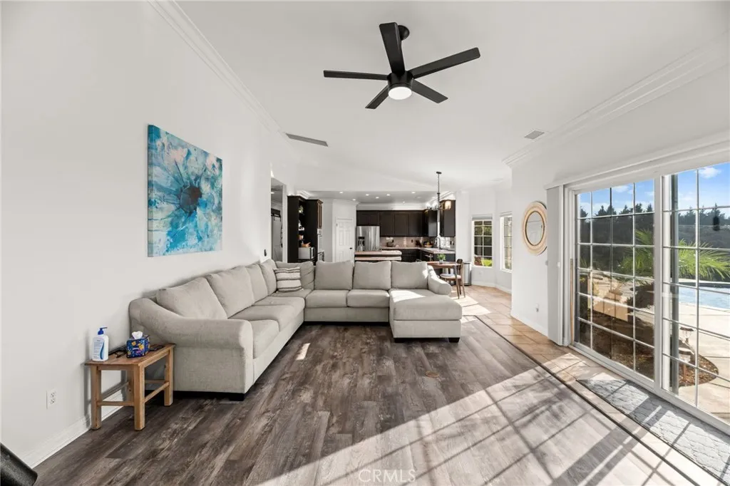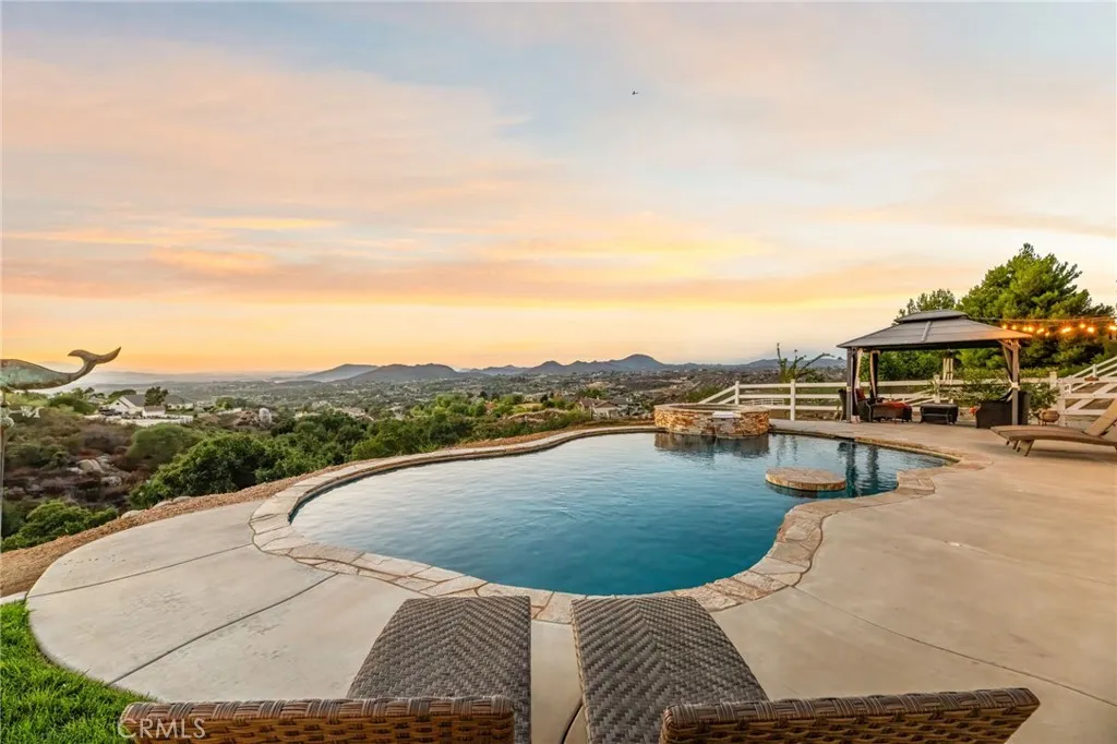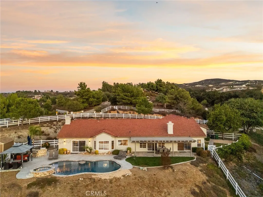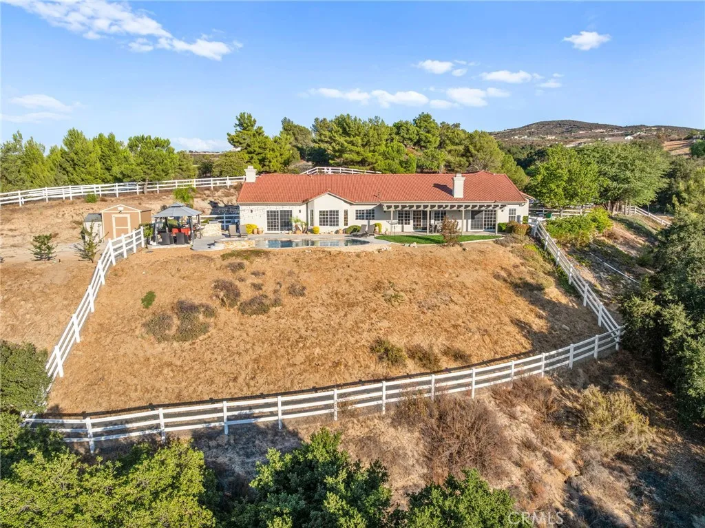 Experience unparalleled country living in Temeculas prestigious Glen Oaks Community, nestled among tranquil rolling hills and award-winning wineries. This single-story estate, set on 4.41 lush acres, offers 4 bedrooms, 3 bathrooms, an office, and 2,833 sq ft of refined living space. Enjoy stunning vistas of Temeculas wine country, where hot air balloons drift across morning skies, creating breathtaking views. This low-maintenance property ensures effortless upkeep, allowing you to embrace the serene lifestyle of this exclusive community. Enter through a private automatic gate, along a scenic driveway to a 4-car garage. The grand double-door entry opens to a luminous living room filled with natural light. The adjacent primary suite features vaulted ceilings, a walk-in closet, and a spa-like bathroom with dual sinks, a soaking tub, and a separate walk-in shower. The heart of the home is the open-concept kitchen and family room. The gourmet kitchen boasts stainless steel appliances, a double oven, a walk-in pantry, and ample cabinetry. Expansive windows in the family room frame stunning winery views, infusing warmth and tranquility. Step outside to enjoy morning coffee on a private, shaded patio, where hot air balloons float above Temeculas rolling vineyards. Relax in a tranquil outdoor haven with a charming gazebo, a sparkling pool, and a soothing spa. The estates 42 fully paid-off solar panels, producing 28.5 MWh in 2024, ensure exceptional energy efficiency, complemented by a 14-50 EV outlet in the garage and a Tuff Shed for storing recreational gear. Ideal as a serene retr