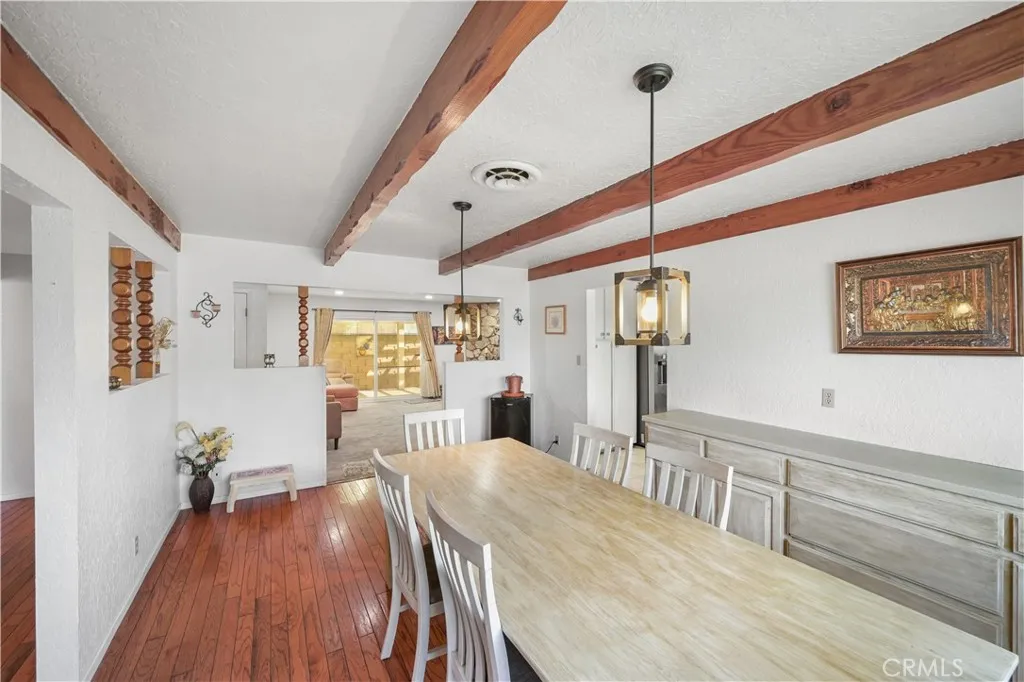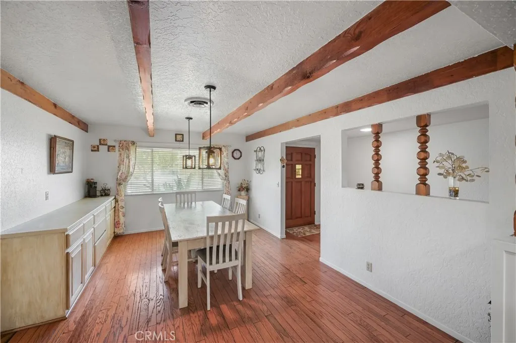 Nestled in the heart of Hemet, CA, this charming single-story home offers an idyllic retreat with a harmonious blend of comfort and style. This 4-bedroom, 2.5-bath residence features exquisite exposed beams in the dining room, adding a touch of rustic elegance to your family gatherings. The spacious living area boasts a large fireplace, perfect for cozy evenings. Outdoors, a beautifully landscaped yard includes mature LEMON, PEACH and NECTARINE trees. Unwind with a sparkling pool and spa providing a luxurious oasis for relaxation. Entertain guests with ease at the wet bar, and enjoy ample storage space in the oversized garage. Located in a vibrant community, this home is close to local attractions such as the Western Science Center, Diamond Valley Lake, and the Ramona Bowl Amphitheatre, offering a variety of recreational and cultural activities. Whether you're seeking tranquility or adventure, this Hemet gem provides the perfect backdrop for your Southern California lifestyle.