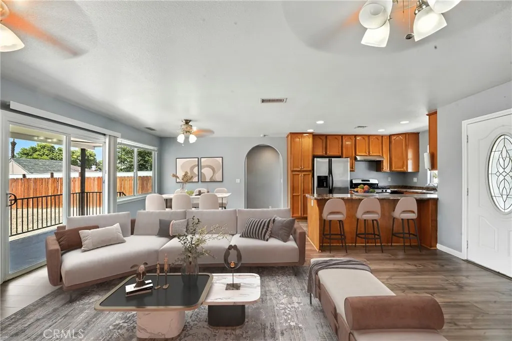 Welcome to this spacious home located in the heart of Hemet. This property offers 3 bedrooms, 2 bathrooms, plus a bonus bedroom. The open-concept floor plan features a large living room that flows into the dining area and kitchen. The kitchen provides ample cabinet space and functionality for everyday use. The bedrooms are generously sized, and the home is equipped with central air conditioning and heating. A sliding glass door leads to the backyard, offering plenty of space for outdoor activities and entertaining. Additional improvements include recent interior and exterior paint, giving the home a fresh and updated appearance. This move-in-ready home combines space, comfort, and conveniencean excellent opportunity for buyers seeking a well-maintained property in Hemet.