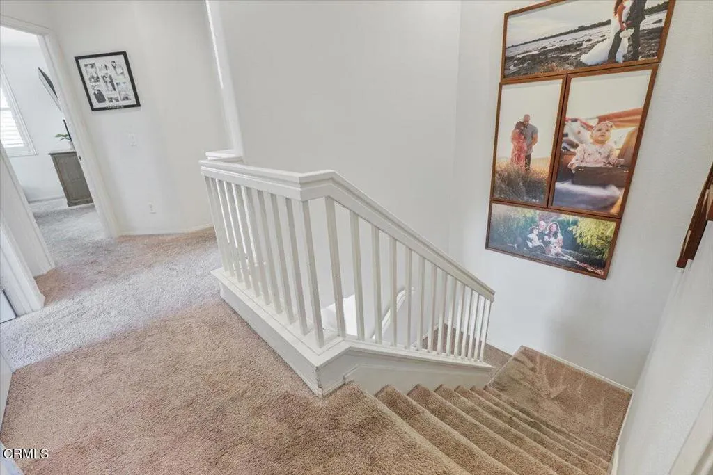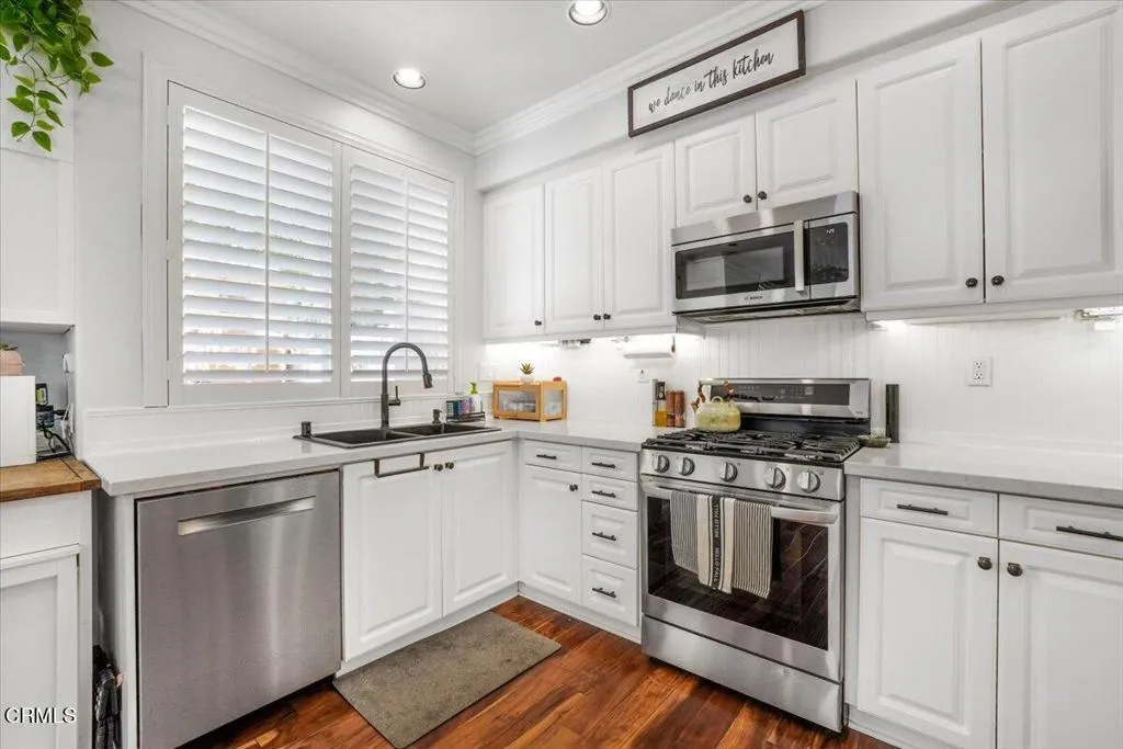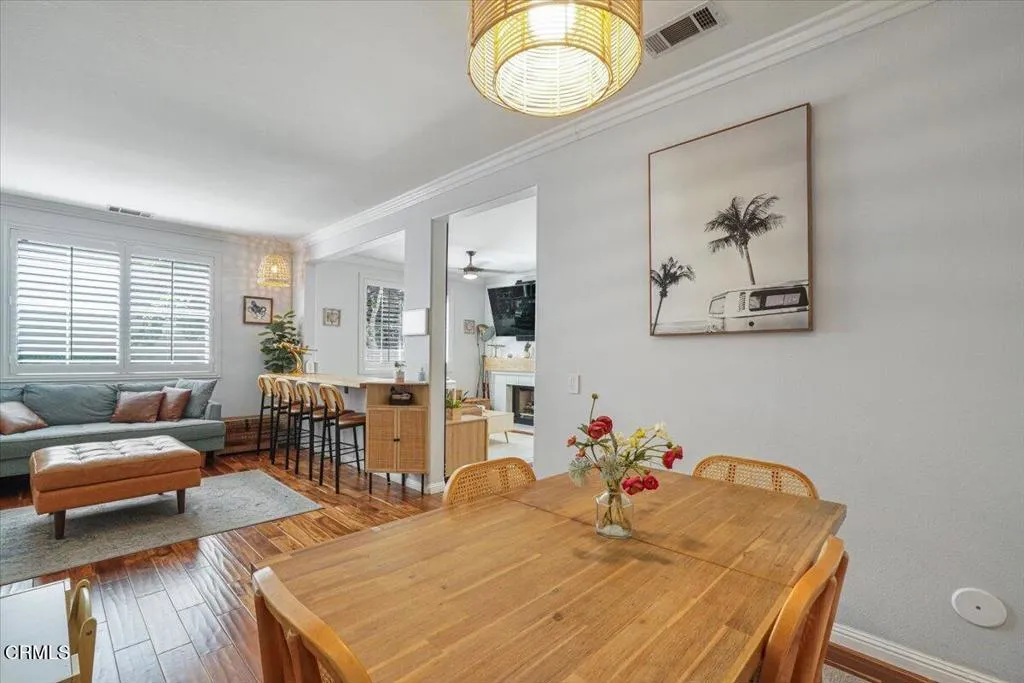 This beautifully updated 3-bedroom, 2.5-bath end-unit townhome offers 1,537 sq. ft. of bright and stylish living space. The main level features a spacious living room with wood floors and crown molding, a modern kitchen with white cabinetry, quartz counters, stainless appliances, and a breakfast bar, plus a flexible dining/family area with a cozy fireplace. Enjoy the private gated patio with low-maintenance turf and a charming playhouse--perfect for relaxing or entertaining. Master Suite features a walk-in, and a spa-inspired bath with dual vanities, soaking tub, and separate shower. Thoughtful upgrades include plantation shutters, dual-paned windows, Nest thermostat, shiplap accents, and an upgraded 2-car garage with cabinets, racks, and a workspace. Community amenities include a pool, playground, RV parking, and beautifully landscaped grounds, all just minutes from shopping, dining, freeway access, and Camarillo High School. A one-of-a-kind under-the-stairs kids' playhouse adds the perfect finishing touch to this unforgettable home.