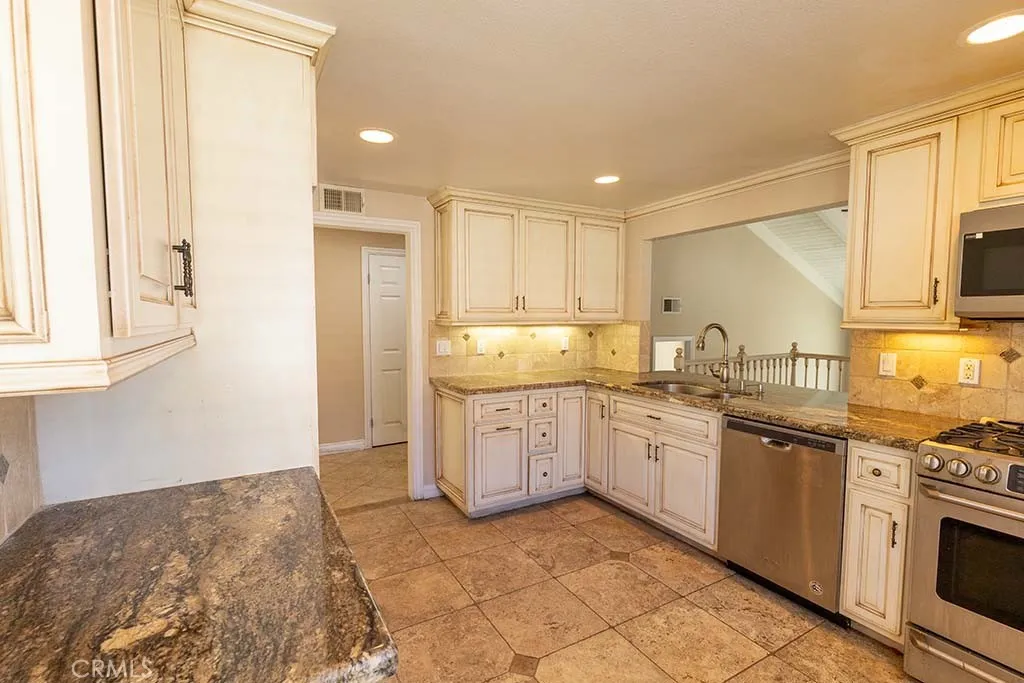 Highly sought after model in Fairway Village! End unit with 3 bedrooms 2 bathrooms with approximately 1572 sq ft. Updated kitchen with stainless appliances granite counters and stone flooring. Other features include, double door formal entry, Cathedral ceilings, ceiling fans, and built in cabinet in guest room. The Primary bedroom is located on the lower level with ensuite bath, with dual sinks, walk in closet and and large walk in shower with a private balcony. There is new carpet in the bedrooms and fireplace in living room with sliding door to the large balcony. Convenient 2 car attached garage and plenty of guest parking. This secure community has a 24 hour guard at the gate, and many HOA amenities to include pool, spa, clubhouse, pickle ball ,tennis courts, and meandering greenbelts. Located close to St Jude Hospital and the vibrant life of Downtown Fullerton. Won't last!