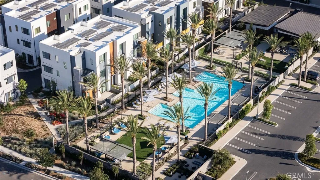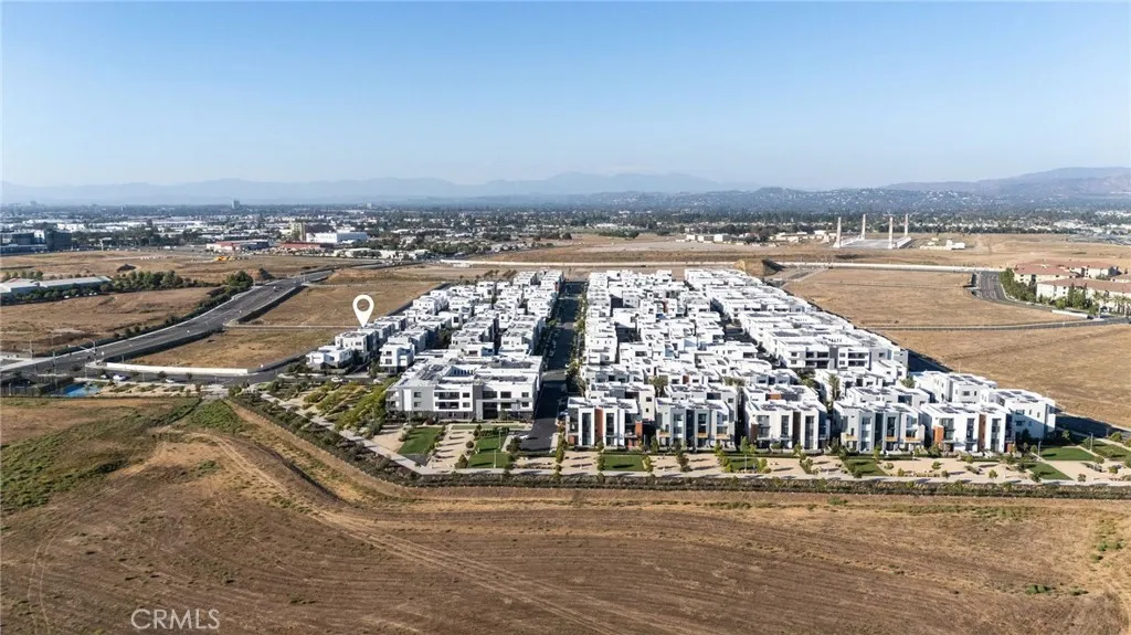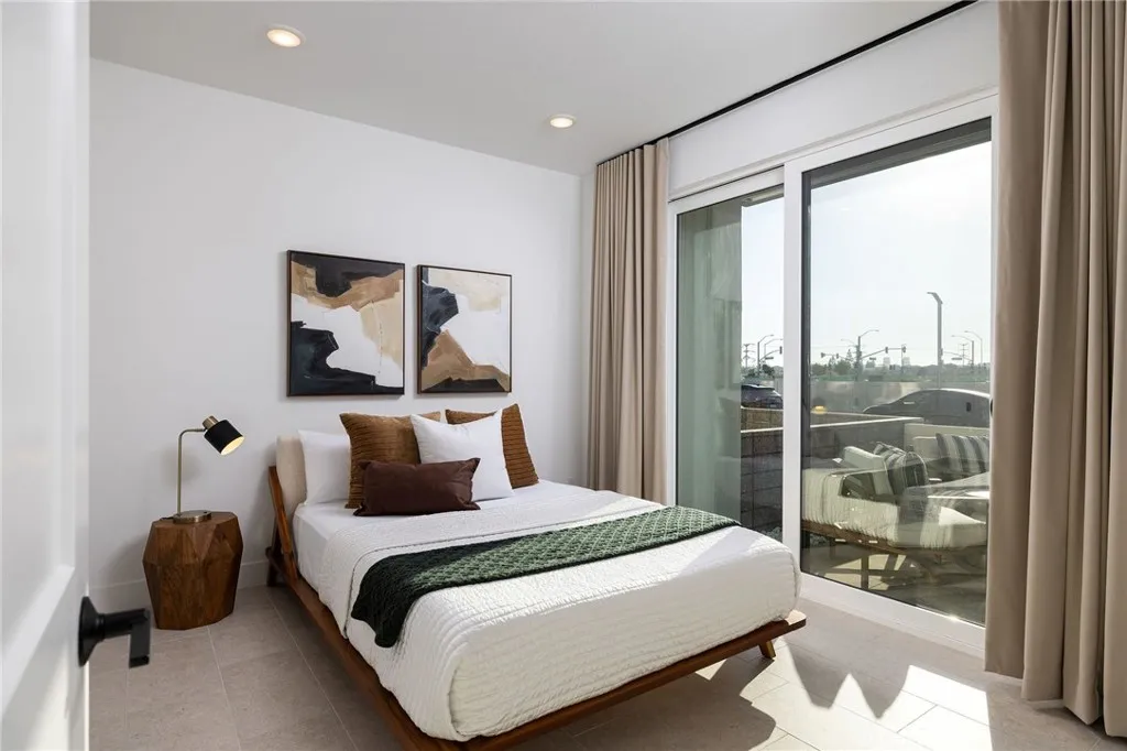 This newly built luxury townhome in The Landing at Tustin Legacy offers the perfect blend of modern sophistication and everyday convenience in one of Orange County's most desirable new communities. Completed in 2023, this light-filled contemporary home welcomes you with an open-concept layout featuring soaring 12-foot ceilings, imported Italian stone floors, and sleek matte black designer finishes that create an atmosphere of understated elegance. Enter the 3-story plan through the thoughtfully designed lower level that includes an ensuite bedroom (or optional office or fitness room) and direct access to the two-car garage. This space also opens directly to a sunny patio, bringing the outdoors in and making for a welcoming curb appeal. Large windows fill the second-level great room with natural light, creating an ideal environment for both entertaining guests and everyday relaxation. The living room flows seamlessly to a private balcony, extending your living area outdoors. The luxe chef's kitchen is finished with full-height maple cabinetry, a complete stainless steel JennAir/KitchenAid appliance suite, and a striking quartz island ready for casual bites and conversation. Upstairs, two generously sized bedrooms each provide ample accommodation with large windows and spacious closets. The primary suite serves as a true retreat, with two walk-in closets featuring professional organizers and a spa-like bathroom with double sink vanity and oversized shower. Modern convenience is built-in, with smart features including paid solar panels, an EV charger, Google Home smart system,
