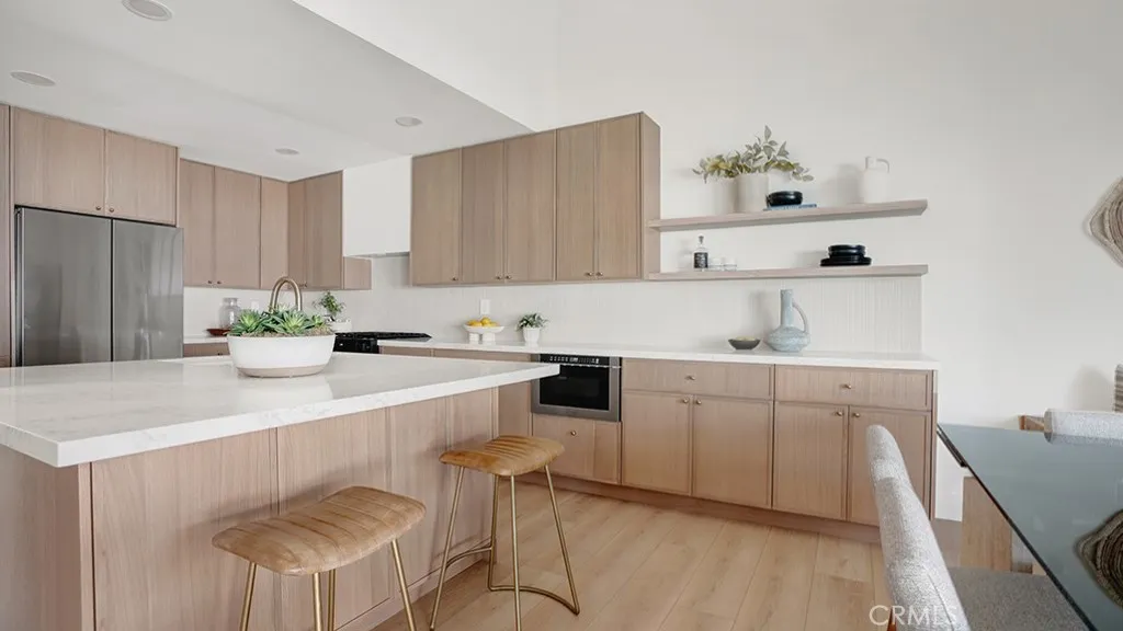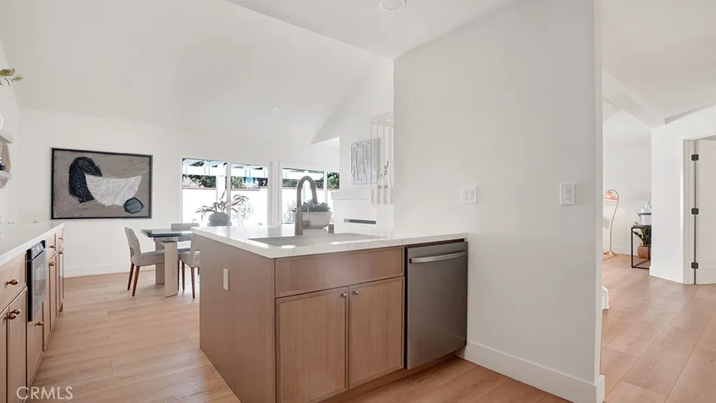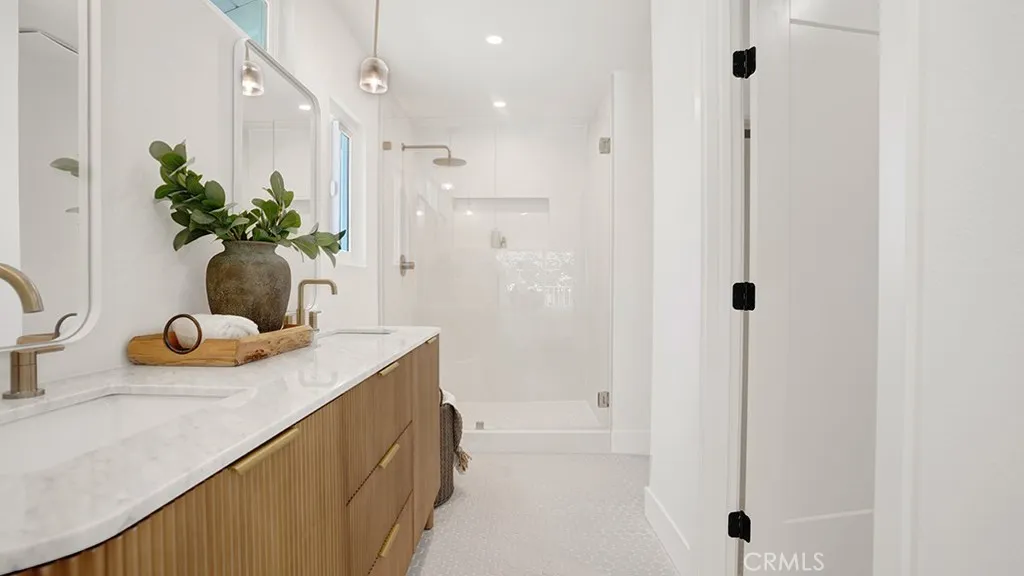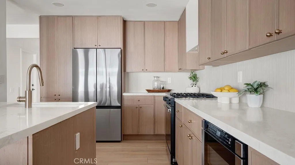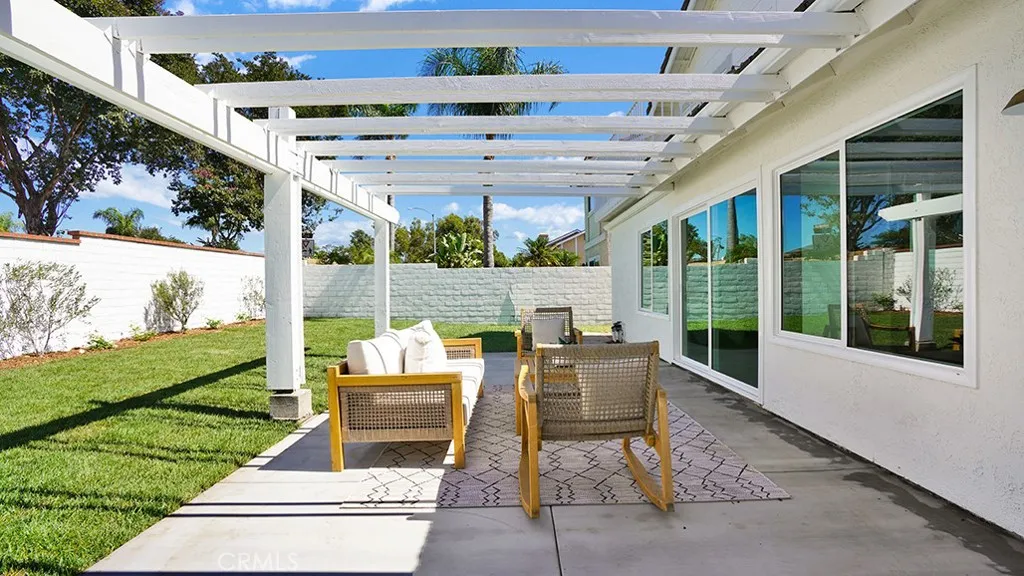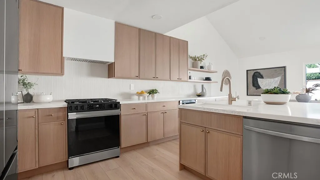 Welcome to a thoughtfully reimagined Irvine home framed by lush new landscaping and an inviting courtyard. Step inside to white-oak luxury vinyl plank flooring, LED recessed lighting, new baseboards and casings throughout. The heart of the home is a warm, plaster-finished wood-burning fireplace that anchors the open living space. A designer kitchen showcases slim oak-shaker cabinetry, quartz countertops, a tile backsplash, quartz sink, champagne-bronze fixtures, and a suite of new appliances including a bespoke range, dishwasher, and over-the-range microwave. Dual-pane windows and new sliding doors invite easy indoor-outdoor living to a fully refreshed backyard with new concrete patio and vinyl fencingperfect for gatherings. Guest bedrooms feature upgraded lighting and closet systems; the hall bath includes an oversized soaking tub and tiled shower niche. The spacious primary suite adds a double vanity, designer tile, and crystal-clear Starphire shower glass for a spa-like feel. Modern touches include matte-black hardware with solid-core doors, new outlets/switches, a smart thermostat with tuned-up HVAC, epoxy-finished garage with new door motor/keypad, and a 200-amp electrical panel. Turnkey and move-in ready.