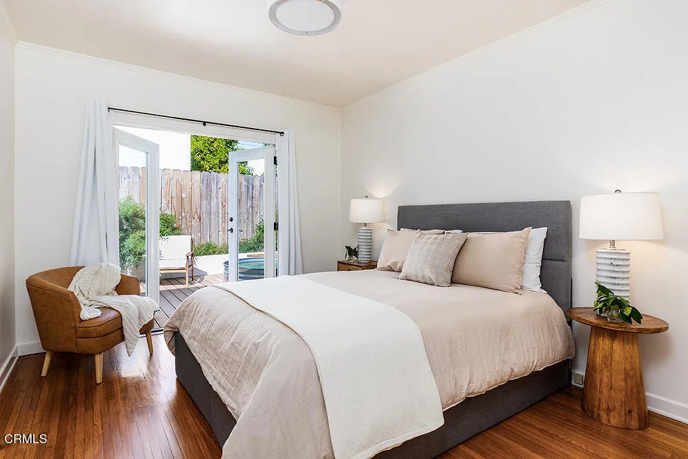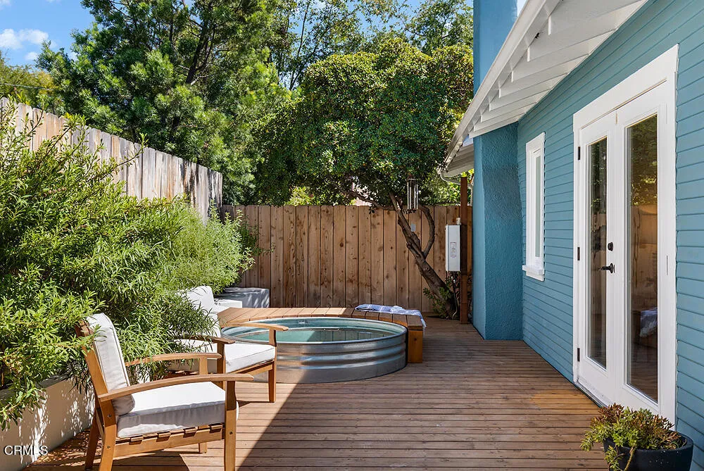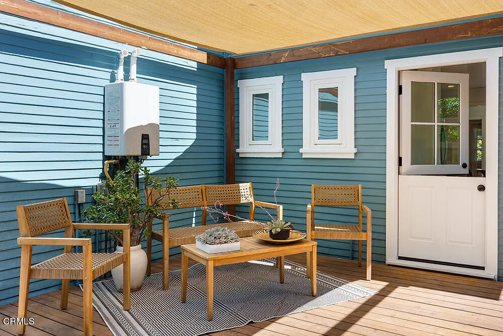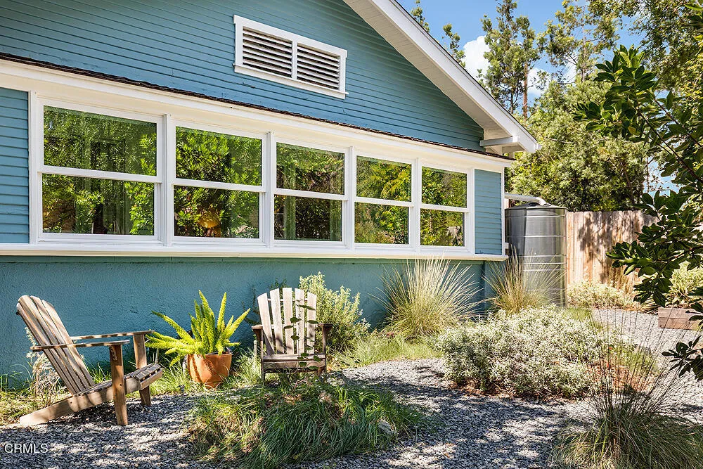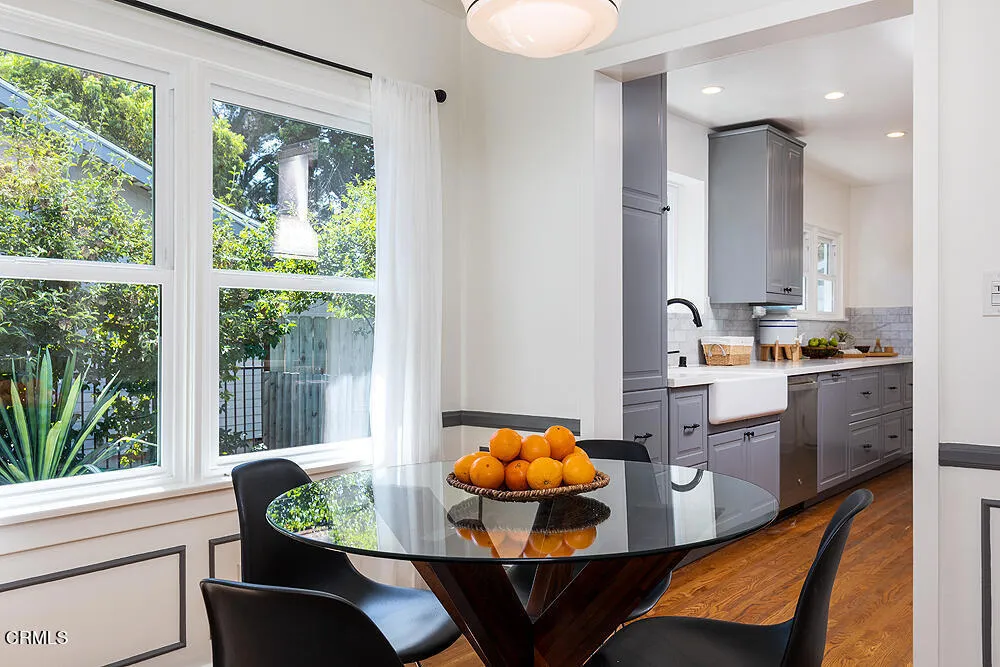 In tree-lined Northwest Pasadena, this stylishly updated home is a real estate unicorn: a light-filled Craftsman that feels both warm AND bright. Secluded behind oaks, agaves and a stately Mulberry tree, the artfully designed gardens here are both beautiful and sustainable with greywater irrigation. Follow flagstone steps on a permeable granite front path to find classic clapboard siding, elephantine column bases and solid 8-light front door with contemporary wood steps that marry modern organic stylings of the garden with the classic architectural elements of this special home. Inside, the front entry with its ribbon of double-hung sash windows and built-in window seat bench is inviting and practical for modern living. A generous living room, with coved ceilings, decorative stacked brick fireplace and dual-pane casement windows, also accomodates formal dining. The floorplan flows well here, with the sunny breakfast room and remodeled kitchen to the south, and private spaces to the north. Kitchen features marble subway tile backsplash, stone counters, stainless steel appliances and ample storage. A farmhouse sink with a leafy green view and Dutch door opening to the backyard dining deck make for happy everyday vibes. Bedrooms and baths are updated and relaxed, each bedroom enjoying its own bonus feature: access to the sunny north deck and garden; en-suite bath; or pretty views - the mountain vista from upstairs is great. The spacious primary suite with dual-sink marble vanity and rainhead shower is elegant and comfortable, but the spacious attached laundry may be the icing