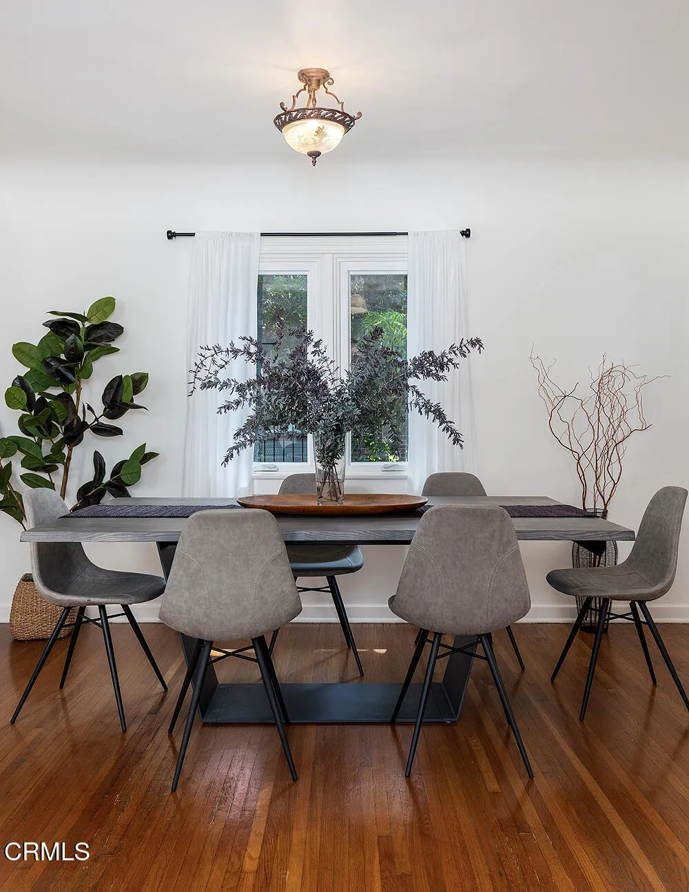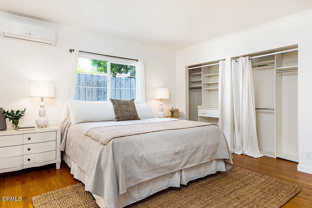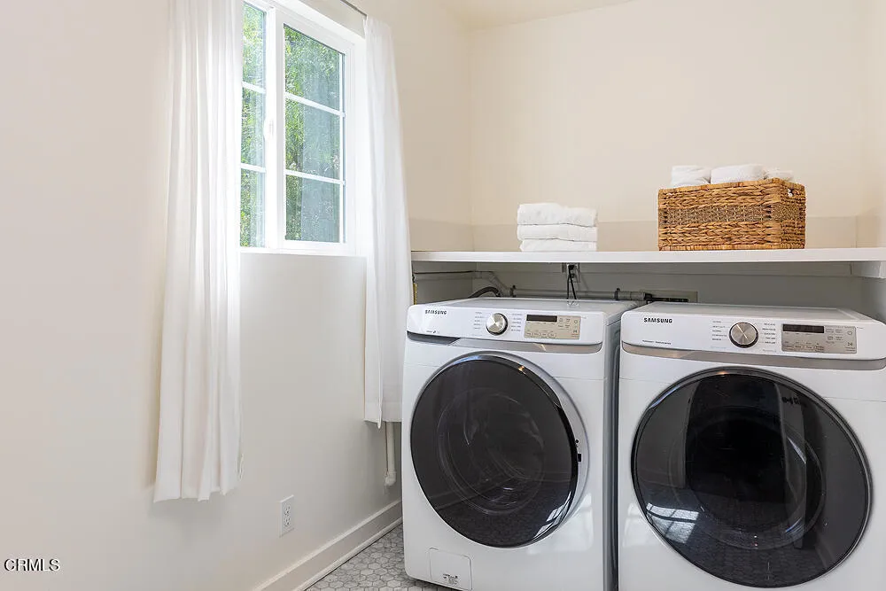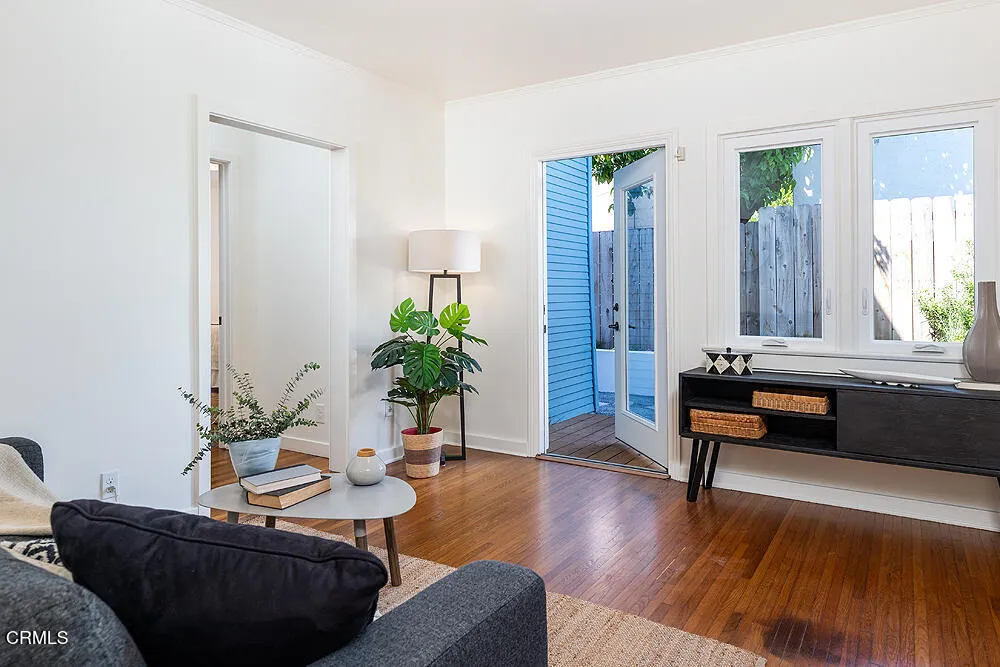 In tree-lined Northwest Pasadena, this stylishly updated home is a real estate unicorn: a light-filled Craftsman that feels both warm AND bright. Secluded behind oaks, agaves and a stately Mulberry tree, the artfully designed gardens here are both beautiful and sustainable with greywater irrigation. Follow flagstone steps on a permeable granite front path to find classic clapboard siding, elephantine column bases and solid 8-light front door with contemporary wood steps that marry modern organic stylings of the garden with the classic architectural elements of this special home. Inside, the front entry with its ribbon of double-hung sash windows and built-in window seat bench is inviting and practical for modern living. A generous living room, with coved ceilings, decorative stacked brick fireplace and dual-pane casement windows, also accomodates formal dining. The floorplan flows well here, with the sunny breakfast room and remodeled kitchen to the south, and private spaces to the north. Kitchen features marble subway tile backsplash, stone counters, stainless steel appliances and ample storage. A farmhouse sink with a leafy green view and Dutch door opening to the backyard dining deck make for happy everyday vibes. Bedrooms and baths are updated and relaxed, each bedroom enjoying its own bonus feature: access to the sunny north deck and garden; en-suite bath; or pretty views - the mountain vista from upstairs is great. The spacious primary suite with dual-sink marble vanity and rainhead shower is elegant and comfortable, but the spacious attached laundry may be the icing