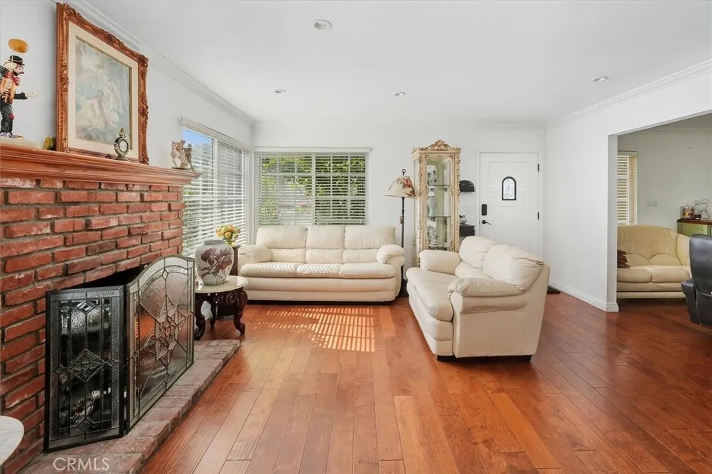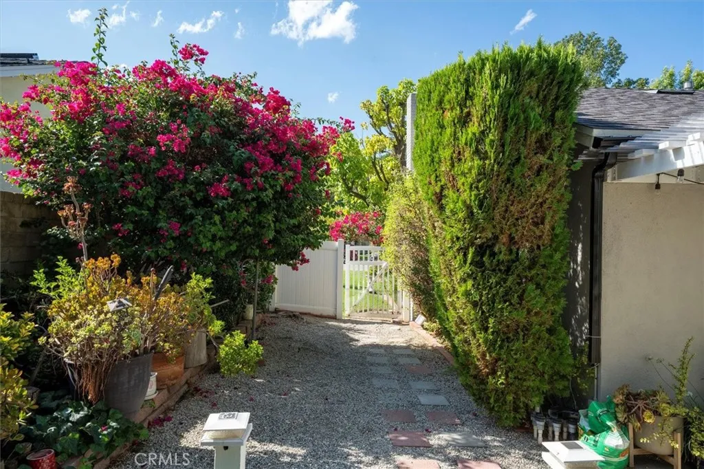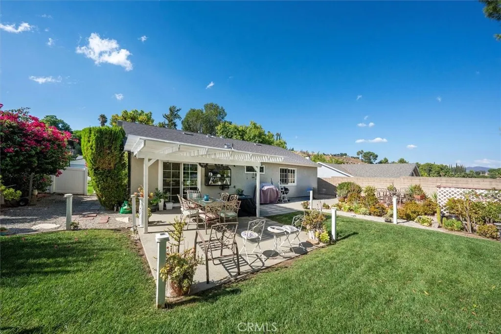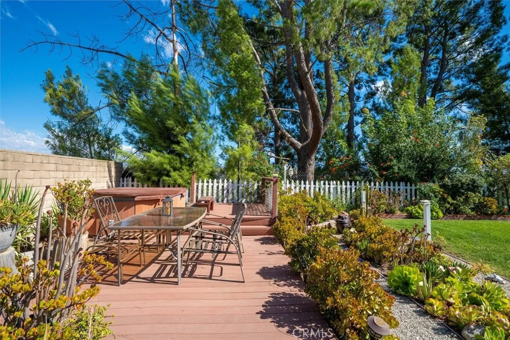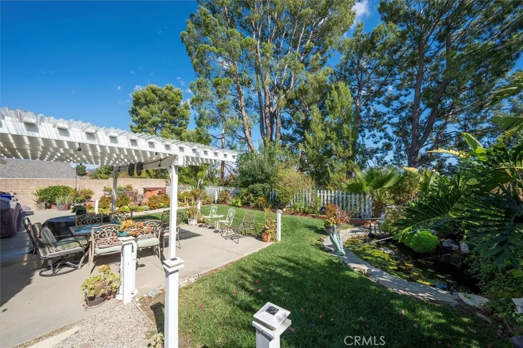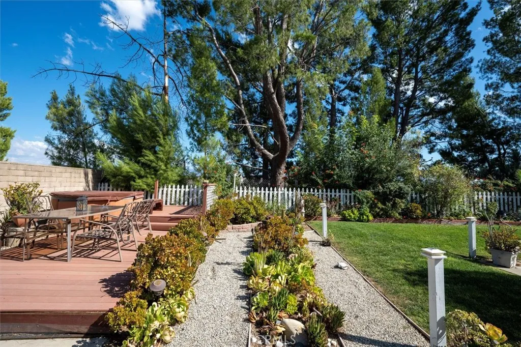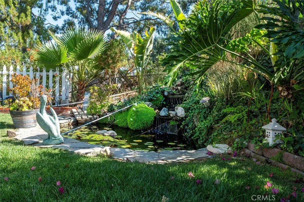 Welcome to this beautifully maintained 4-bedroom, 2-bathroom single-family home that radiates high curb appeal and charm from the moment you arrive. A lush front yard with vibrant landscaping, manicured shrubs, and colorful blooms leads you to an inviting entryway. Upon entering, you will find a well-lit interior with abundant natural light, an inviting open floor plan, and tasteful upgrades that enhance both style and comfort. The spacious living room, to your right, features a brick fireplace and large windows, flows into the dining area and kitchen. The kitchen has granite countertops, a stainless steel double oven and a new S/S dishwasher. Off of the kitchen is the laundry closet. Adjacent to the dining area is the newer glass sliding door that opens to the large backyard with a patio cover. The backyard, with mountain views, is a private oasis, filled with mature greenery and a succulent garden. At the far right corner of the yard lies a serene koi pond with a cascading waterfall. At the far left of the yard, there is a wooden deck with a jacuzzi. This outdoor space is perfect for relaxing and entertaining. Back inside, this lovely home features a master bedroom with an en-suite bathroom, 3 additional bedrooms, and a hallway bathroom. The first bedroom, located on the left side, was turned into a recreational room with the door taken out. The other 2 bedrooms and the master have mirror closet doors. Both the master bath and hallway bath have upgraded vanities and fixtures, and the hallway bath also has newer glass enclosure for the tub. Ceiling fan in the master bedroo