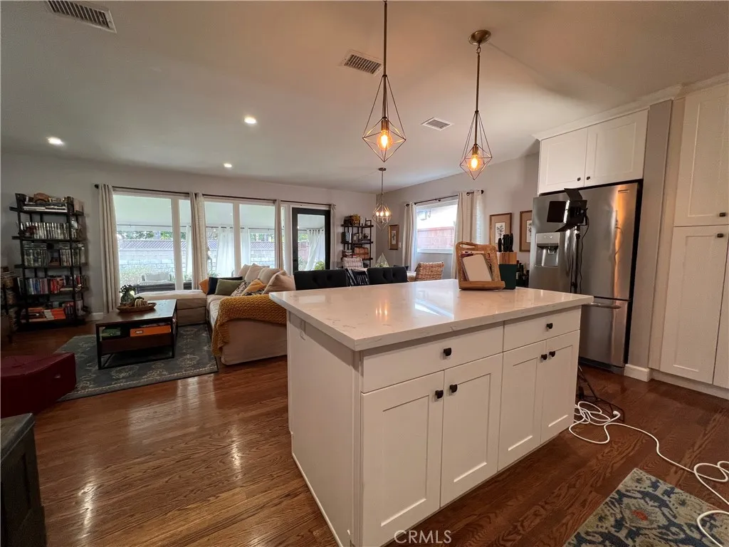 Lovely Long Beach home in the highly sought-after Los Altos neighborhood! Just minutes from the Southern California coast and steps from El Dorado Park, Nature Center, and Golf Course, this beautifully updated 3-bedroom, 2 bathroom residence offers the perfect blend of comfort, convenience, and style. Situated on a 5,828 sq ft lot with 1,608 sq ft of living space, it is turnkey and filled with thoughtful upgrades. Natural light pours into the spacious living room through floor-to-ceiling windows, showcasing recessed lighting, and stunning geometric pendant fixtures in the entry, kitchen, and dining areas that add a touch of modern flair. The remodeled kitchen features granite countertops, a large island with extra storage and seating, soft-close cabinetry, a farmhouse apron sink, stainless steel appliances including a gas stove with vent hood, and a custom herringbone backsplash with Forever Grout. A cozy den with a beamed ceiling and striking herringbone-tiled fireplace is brightened by a sliding glass door near the front entry. The primary suite serves as a private retreat, with a double-vanity bathroom and walk-in shower. Two additional bedrooms offer generous closets, while hall storage and built-ins add both function and charm, and bathrooms are well-appointed. Throughout the home youll find oil-rubbed bronze hardware and fixtures, ceiling fans in every room, custom window treatments, and original hardwood floors. Recent upgrades include a brand-new central AC unit. Outdoors, enjoy a welcoming and landscaped backyard with a covered patio perfect for entertaining, a flo