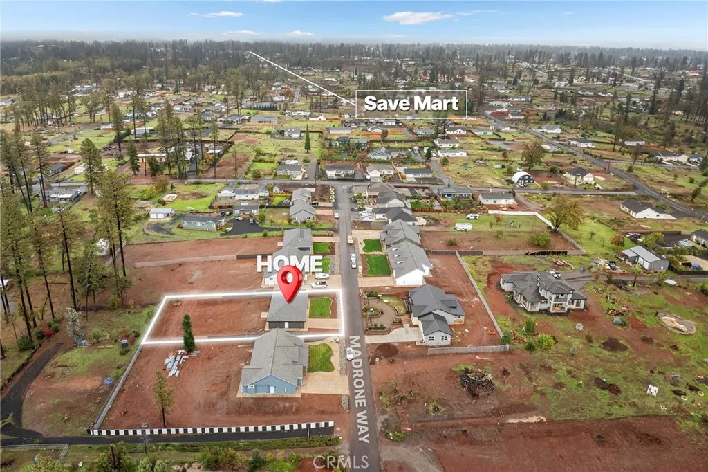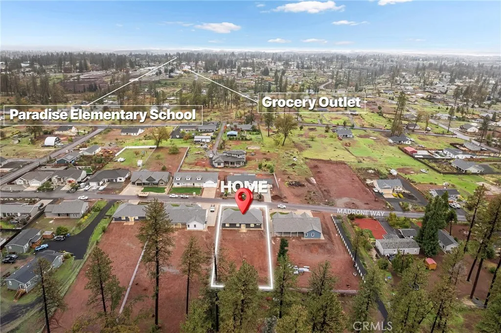 Modern design meets small-town charm here! This beautiful 3-bed, 2-bath home sits on one of Paradises most desirable, newly built streetslined with gorgeous stick-built homes. Gone are the days of wondering what might be built next door; Madrone Way offers peace of mind and a true sense of community. If this home isnt the one, come see what else is available on Madrone! Step inside and youll immediately be greeted by 9 ceilings throughout, with 10 tray ceilings in both the living room and the primary suite. The finishes set this home apart, with the green fireplace serving as an instant showstopper. The open-concept layout is perfect for entertaining, featuring a spacious kitchen with an L-shaped island and plenty of room for barstoolsideal for gatherings and everyday living. This split floor plan places two bedrooms, a full bath, and the laundry room on one side, while the primary suite enjoys its own private retreat on the other. The primary bathroom feels like a spa getaway, showcasing a striking wet room with a tile shower and soaking tub, all enclosed in glass for a sleek, modern touch. From the primary suite and back patio, enjoy beautiful sunsets that fill the sky each evening! Outside, youll love the fully fenced backyard, perfect for pets, play, and privacy. The location is unbeatabletucked on the west side of town with a short drive to beloved Bille Park and easy access to Skyway, making it simple to reach anywhere in Paradise or beyond in minutes. Built by American Dream Construction, a trusted local builder known for quality and craftsmanship, this home includes