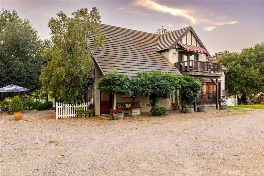 There is a place, tucked among the rolling hills of Paso Robles Wine Country, where time slows and the air carries the soft perfume of oak and vine. This magical estate, set on approx. 38.2 gently sweeping acres along coveted Vineyard Drive, is a haven of warmth, charm, and grace. The main residence, resting gracefully among the trees, radiates timeless character and sophistication. Inside, every detail has been thoughtfully crafted three spacious bedrooms, three full baths, one three-quarter bath, and one half bath designed for comfort and ease. The kitchen is a gathering place, featuring a cozy breakfast nook with a Dutch door opening to the sunlit backyard and multiple seating areas. A formal dining room invites evenings of conversation, while the family room with a spectacular indoor/outdoor stone fireplace and multiple double doors spills onto a wraparound porch overlooking vineyards, oak groves, and rolling hills. Nearby, the Carriage House mirrors the Main Homes craftsmanship. Upstairs offers open-concept living, balconies with stunning views, a kitchen, two bedrooms, and two bathrooms, while below provides an office, hobby room, and workshop. With a B&B License, the Carriage Home is both opportunity and invitation to host, share, and live fully. Every window frames rolling hills, manicured gardens, and golden sunsets. On the porch, evenings pass beneath stars, the stillness broken only by crickets and a whispering breeze. In the heart of Paso Robles Wine Country, life takes on a slower, sweeter rhythm. Mornings bring the scent of lavender and distant quail; evenin