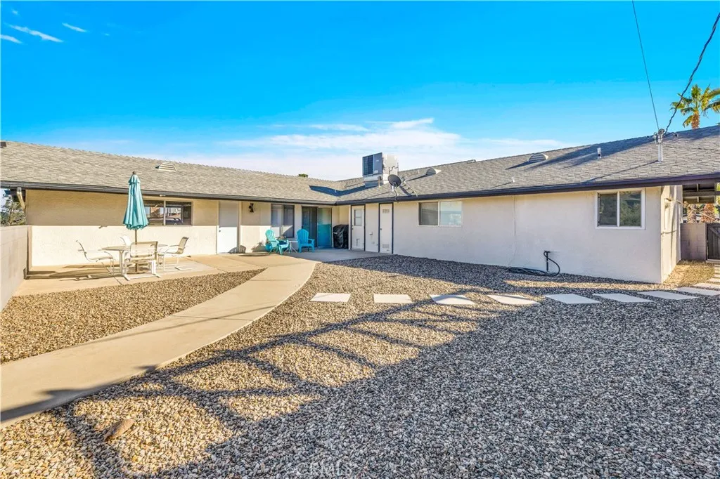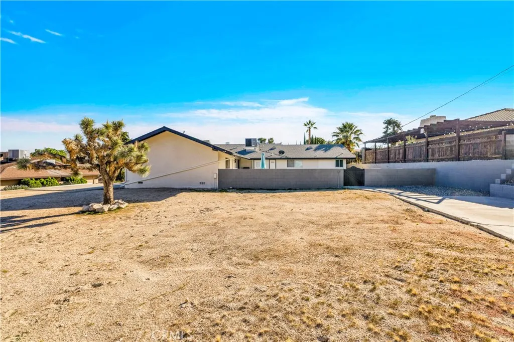 Your dream home awaits in this gorgeously appointed 3 bedroom, 2 bath home situated on just under 1/2 acre of land in the highly desirable Country Club area of Yucca Valley. As you approach the home, you'll love that the neighborhood is tucked close to the majestic desert hills that frame the valley, and appreciate the attached 2 car garage. Sleek, ultra-modern finishes greet you as you enter the home, which has been tastefully updated throughout. The massive main living area enjoys large windows to let in plenty of natural light, an impressive 0 clearance fireplace, and stylish lighting. Polished concrete flooring flows throughout the space, adding to the clean styling of the home. The kitchen is beautifully appointed with quartz waterfall countertops, modern wood cabinetry and all new stainless steel appliances - including a gas range and second oven for the discerning chef. A spacious room off the main living space is perfect for a bonus room or formal dining area, and features high wood-beamed ceilings and two sliding glass doors to access the outdoor living space. Moving on, you'll note the conveniently located laundry room with its own outside access as well. The guest bath continues the theme of modern style with a floating vanity and glass-doored walk-in shower, and each guest bedroom is airy and well let with plenty of closet space. The primary bedroom is huge with large windows and an attached bath with another floating vanity with full tile backsplash, large walk-in glass shower, and closet. Book a showing to experience this beautiful desert sanctuary for yoursel