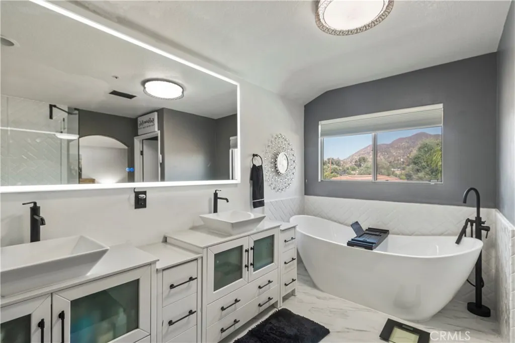 Welcome to your private retreat inside an exclusive gated community in Sylmarwhere luxury living meets smart investing. This beautifully remodeled four-bedroom, three-bath home offers nearly 2,200 sq. ft. of open, light-filled living space with cathedral ceilings, plantation shutters, and modern finishes throughout. The chefs kitchen features granite countertops, travertine backsplash, and a large picture window framing stunning mountain views and your entertainers backyard. Every detail has been upgraded for comfort and efficiency, from the durable vinyl flooring and all-new lighting to the 2025 HVAC system and Tesla solar setup. The primary suite feels like a resort, complete with dual walk-in closets, soaking tub, and walk-in rain shower. Step outside to a private backyard paradiseheated pool and spa with LED app-controlled lighting, oversized covered patio, and lush privacy ficus trees. Heres the game changer: this home includes an assumable loan at 3.5%a rare opportunity for qualified buyers to save thousands over the life of the loan. Located on a quiet cul-de-sac in a secure gated community with easy access to schools, shopping, and major freeways, this home blends elegance, energy efficiency, and financial advantage. Dont waitschedule your private showing today and take advantage of this exceptional offer before its gone!