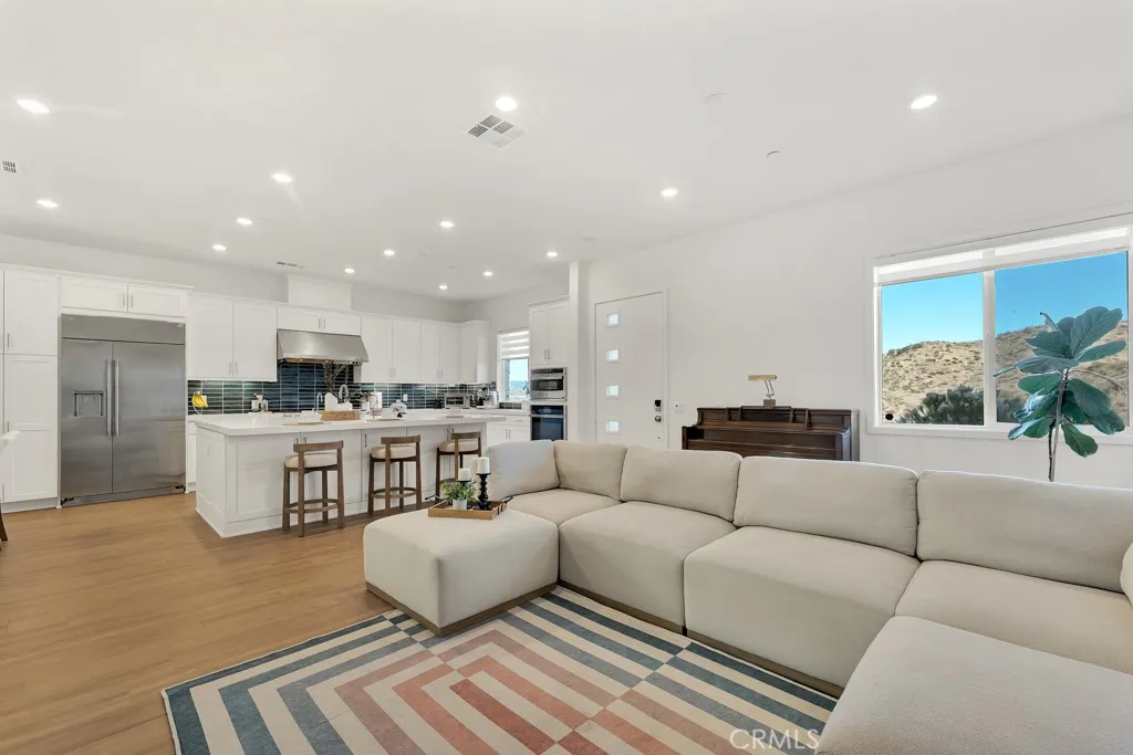 Stunning 2023 Lennar home in Valencias highly sought-after FivePoint Peak community! This 3,349 sq ft contemporary residence features 5 bedrooms, 5 baths, and a versatile three-story layout with 10-ft ceilings. The open-concept main level boasts a spacious great room ideal for entertaining, adjacent to a chefs kitchen with designer finishes, a massive quartz island, and premium Monogram stainless-steel appliances. The dining area flows effortlessly through stackable sliding doors to a private backyard and covered California roomperfect for seamless indoor-outdoor living. A main-level bedroom offers a comfortable space for guests or multi-generational living. Upstairs, the luxurious primary suite showcases a spa-inspired bath and large walk-in closet, accompanied by three additional en-suite bedrooms. The third-floor bonus room captures panoramic mountain and city viewsideal for an office, gym, or media lounge. Energy-efficient upgrades include owned solar, tankless water heater, water softener, and EV charger. Enjoy top-rated schools, scenic trails, parks, pools, and clubhouse amenities within Valencias premier master-planned communityjust minutes from shopping and dining.