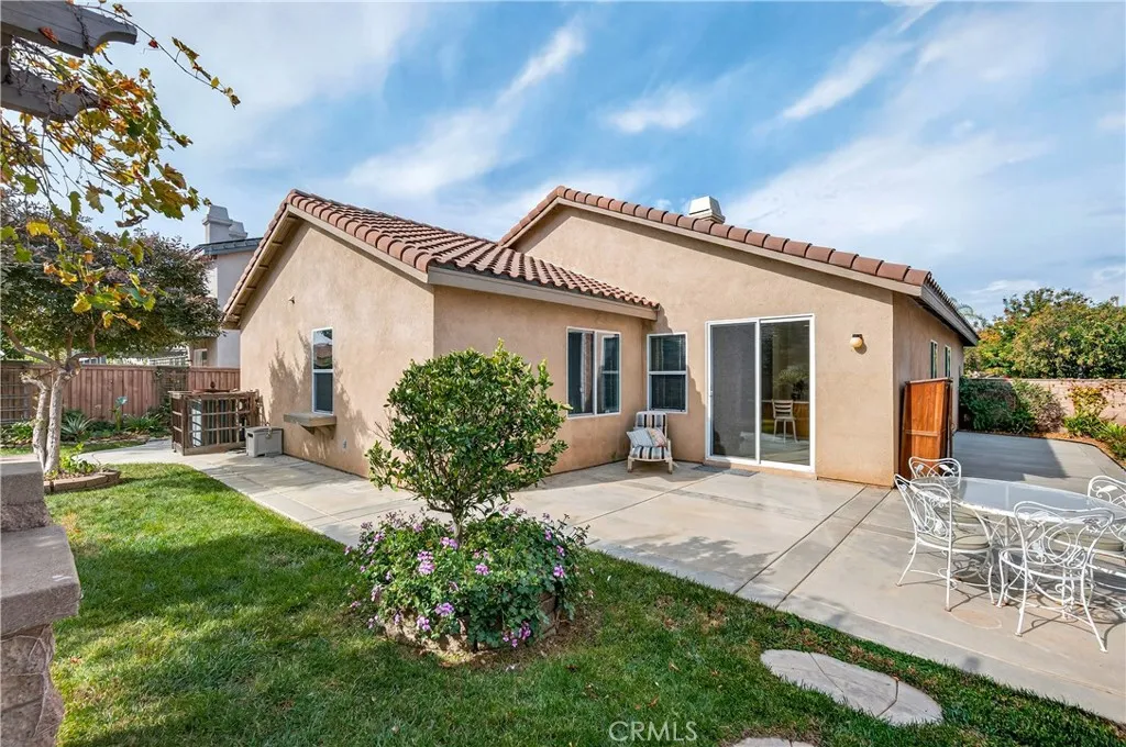 Welcome to 31619 Umbria Lane in the heart of French Valley, California! This beautiful Mediterranean-style single-story home offers the perfect blend of comfort, functionality, and charm. Featuring 3 bedrooms, 2 full bathrooms, and an inviting bonus/flex room, this home provides plenty of space for every lifestyle. Step inside to a bright, open entryway that flows into a spacious formal living and dining room, ideal for gatherings and hosting. The open-concept kitchen overlooks the family room and is designed for entertainingcomplete with stainless steel appliances, quartz countertops with kitchen island featuring custom pullout shelving, abundant cabinetry, and a cozy fireplace that anchors the space. Enjoy the fresh feel of new interior paint, new carpet, and classic tile flooring throughout. Two generous guest bedrooms are conveniently serviced by a full guest bathroom, while the bonus room offers the flexibility to be a home office, playroom, or even a potential fourth bedroom. The primary suite is a true retreat, featuring a dual-sink vanity, separate soaking tub and shower, and a large walk-in closet. Step outside to a peaceful, private backyard designed for relaxation and outdoor living. Youll find a lush grassy area, beautiful landscaping with mature fruit trees (mandarin orange, plum, peach, table grapes, and apricots), raised garden planters, and a spacious concrete patio complete with a shaded pergola and bar-height countertopthe perfect place to entertain family and friends. Additional side-yard space offers even more room for storage. A rare single-story in a h