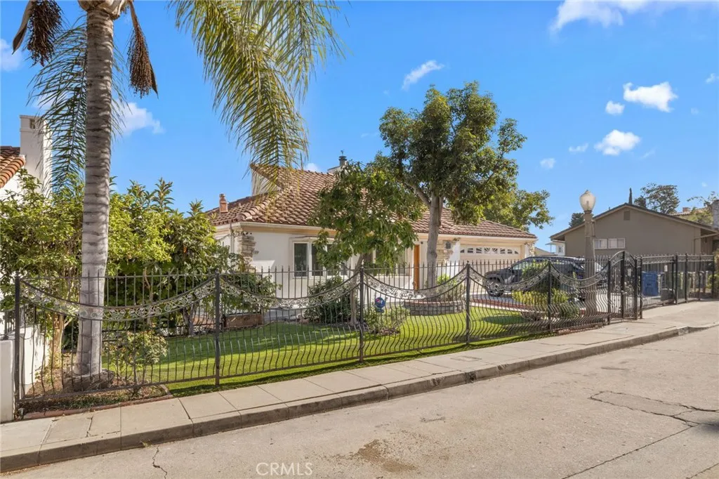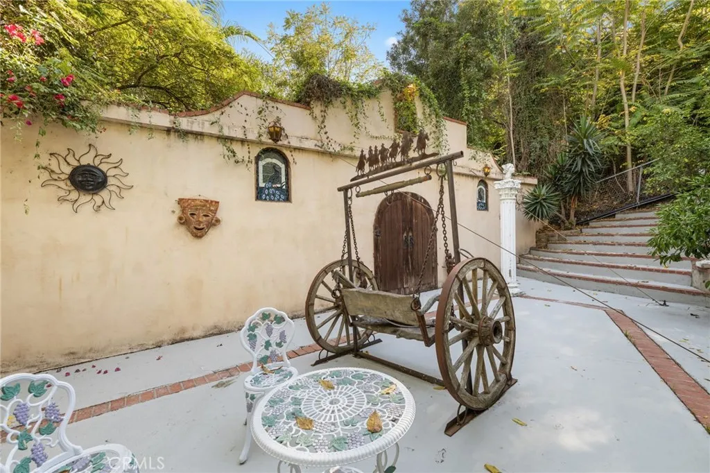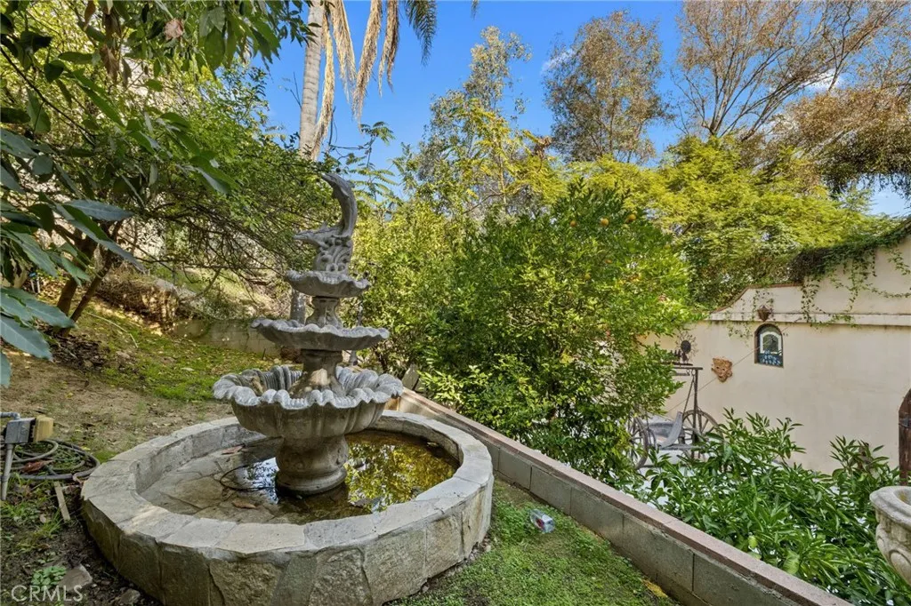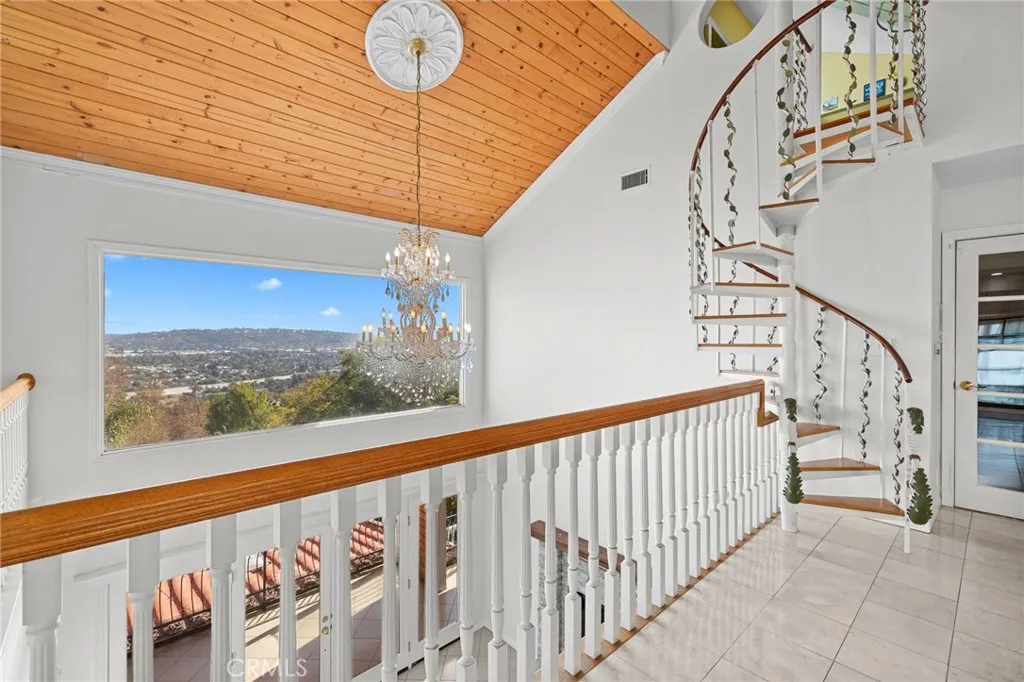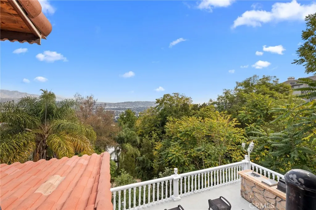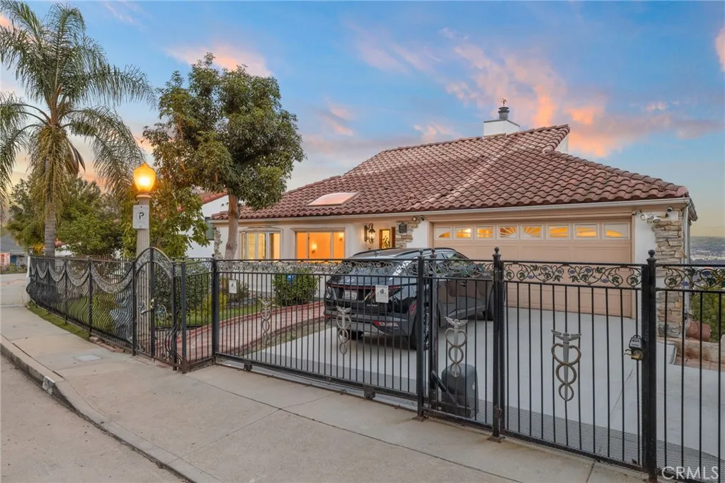 Welcome to this modern Mediterranean style 4 bedroom, 4 bath home in the prestigious Los Feliz hills with amazing views of the city and hillside. The front of the home features an electric gate which leads to the attached two car garage. As you enter this home you are greeted by a dramatic chandelier and expansive windows with incredible views. Several custom stained glass windows throughout add to the ambiance. The spiral staircase in the entry leads to a room that could be a study. The main level of the home includes a bedroom with a full bathroom, a laundry and access to the garage. The floors throughout much of the home are tiled. One level below the entry level is the expansive main living area with pitched ceilings, a dining room, living room with a wood burning fireplace and the entertainment oriented kitchen. The kitchen features an very large center island, a wine rack, granite counters, stainless steel appliances and an abundance of lighting. Included on this level of the home is the primary bedroom with a generous sized walk in closet and a large bathroom with an oversized shower. This level of the home also features two additional bedrooms, a full bathroom, an additional bonus room and a large wine cellar. As you open the exterior doors of these rooms, you find yourself on a generous sized deck that features a BBQ and lounge area, complete with outdoor furniture. But the unbelievable views are the real star of this portion of the property. An added bonus is the completely paid for solar system for lowering the utility bill. Additionally there are exterior stairs