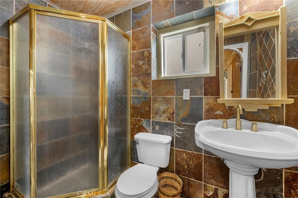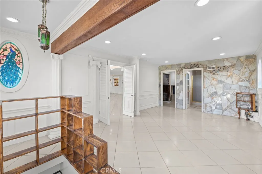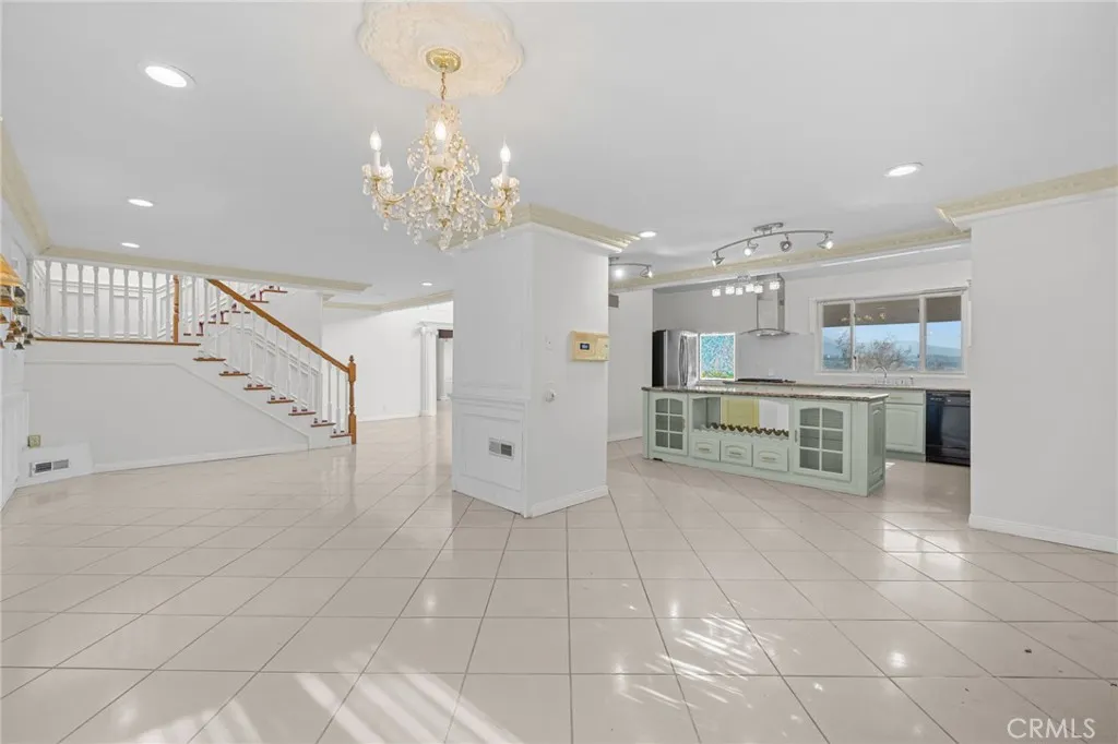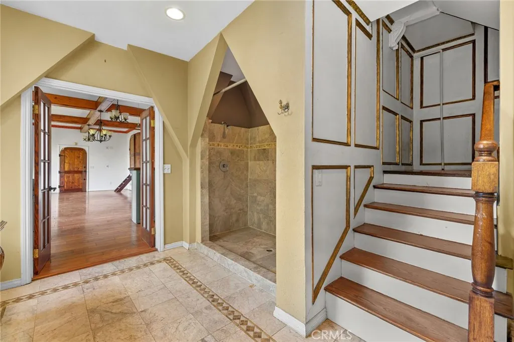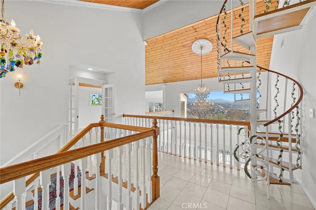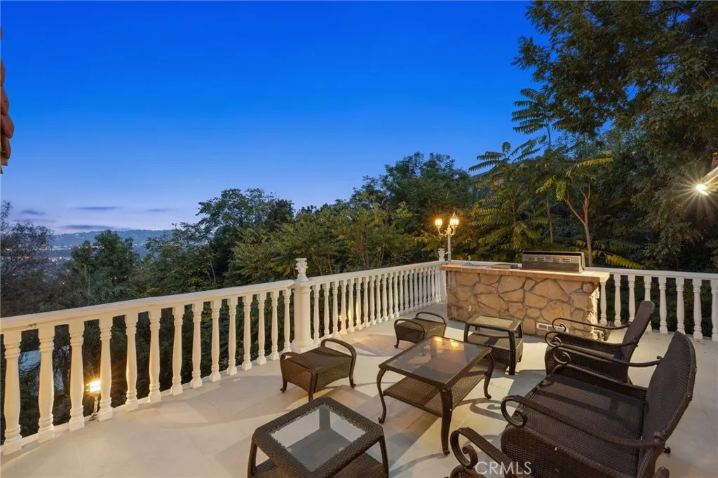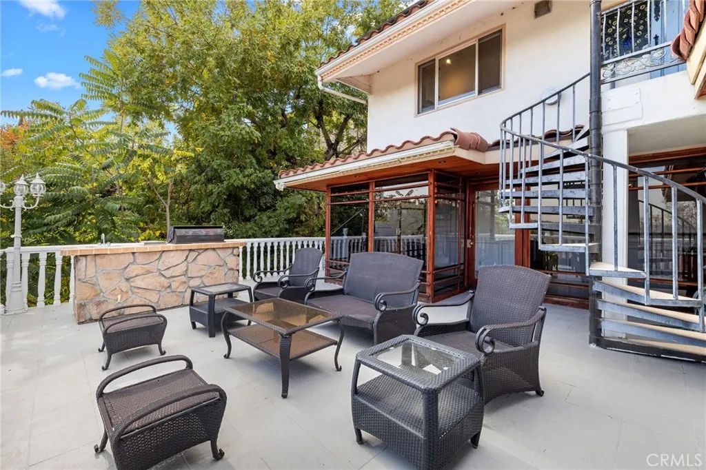 Welcome to this modern Mediterranean style 4 bedroom, 4 bath home in the prestigious Los Feliz hills with amazing views of the city and hillside. The front of the home features an electric gate which leads to the attached two car garage. As you enter this home you are greeted by a dramatic chandelier and expansive windows with incredible views. Several custom stained glass windows throughout add to the ambiance. The spiral staircase in the entry leads to a room that could be a study. The main level of the home includes a bedroom with a full bathroom, a laundry and access to the garage. The floors throughout much of the home are tiled. One level below the entry level is the expansive main living area with pitched ceilings, a dining room, living room with a wood burning fireplace and the entertainment oriented kitchen. The kitchen features an very large center island, a wine rack, granite counters, stainless steel appliances and an abundance of lighting. Included on this level of the home is the primary bedroom with a generous sized walk in closet and a large bathroom with an oversized shower. This level of the home also features two additional bedrooms, a full bathroom, an additional bonus room and a large wine cellar. As you open the exterior doors of these rooms, you find yourself on a generous sized deck that features a BBQ and lounge area, complete with outdoor furniture. But the unbelievable views are the real star of this portion of the property. An added bonus is the completely paid for solar system for lowering the utility bill. Additionally there are exterior stairs