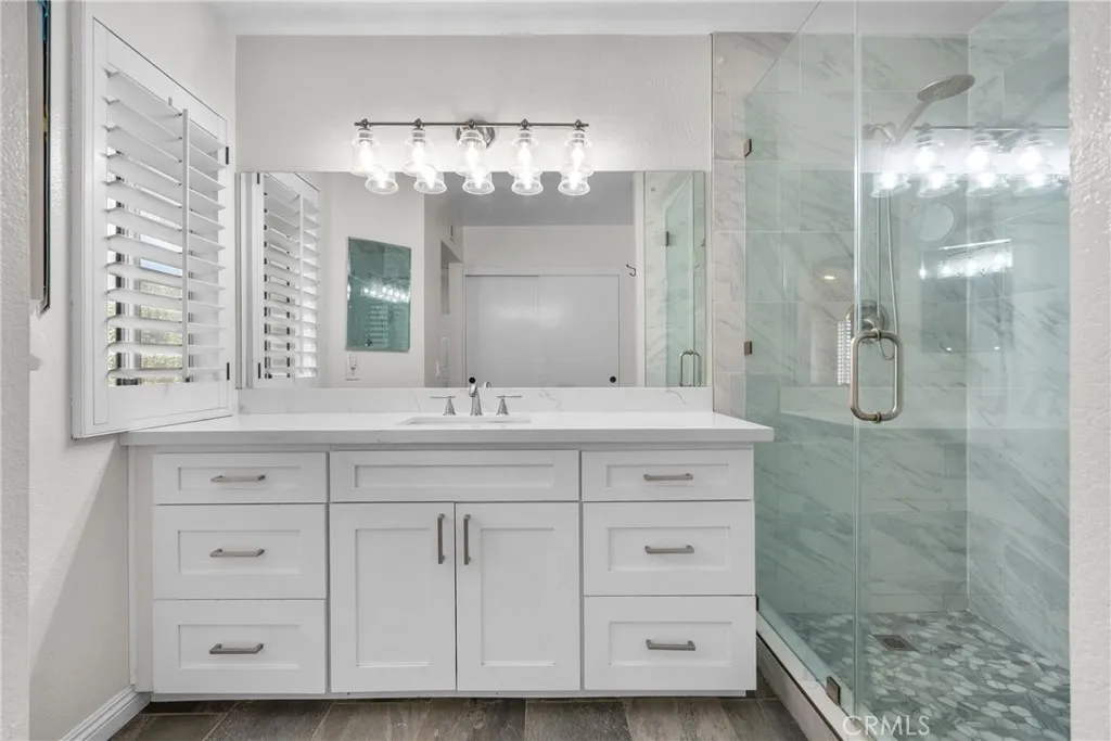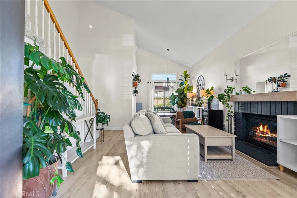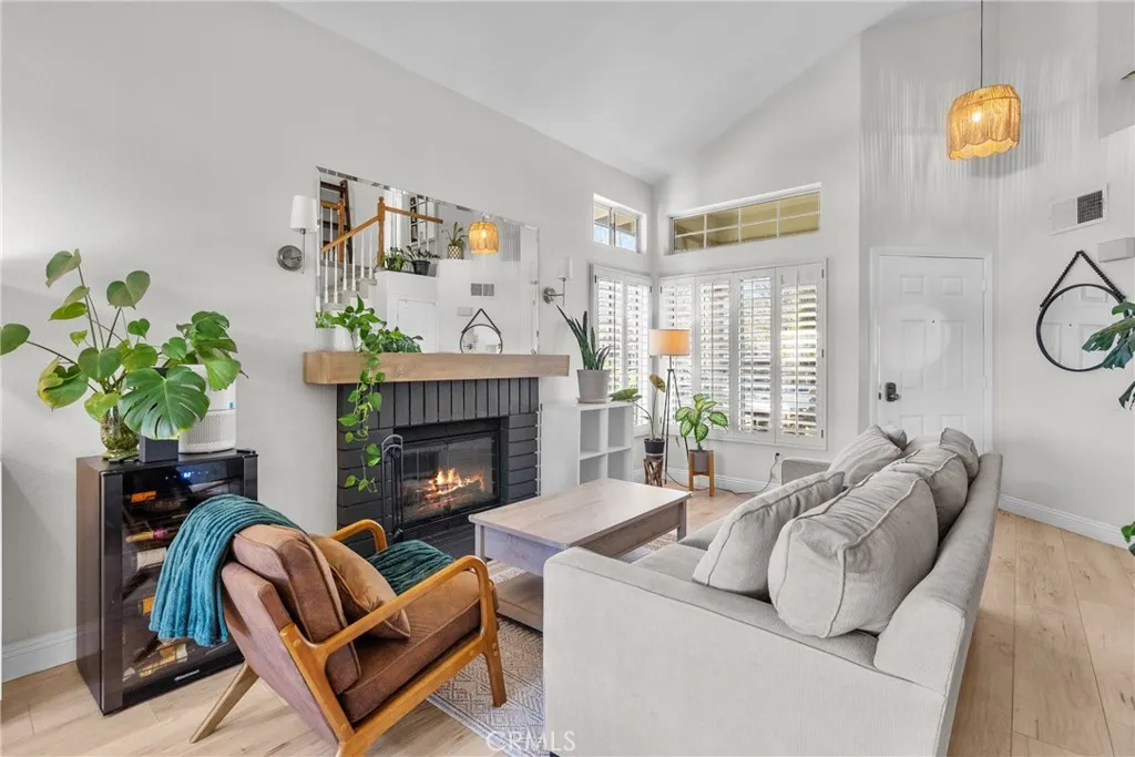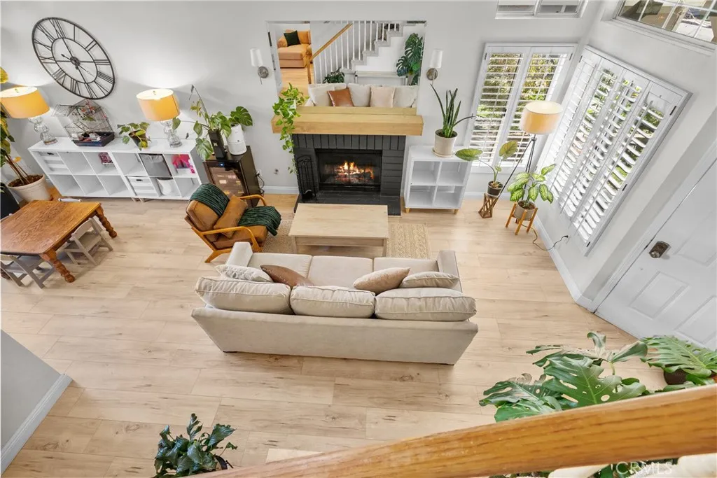 Welcome to this amazing home nestled in a highly desired neighborhood, thoughtfully upgraded and designed for comfort and style. Offering 3 spacious bedrooms and 2.5 baths you will be impressed from the moment you step inside. The gorgeous luxury vinyl plank flooring flow seamlessly throughout the downstairs complemented by the recent upgrades! The living room allows for soaring volume ceilings and a warm, cozy fireplace accented by a custom mantel and mirror, stylish light fixture and plantation shutters highlight the space. At the heart of the home is the remodeled kitchen boasting inviting quartz countertops, decorative backsplash, soft close cabinets with a lazy susan storage, sleek stainless steel appliances, sink, garbage disposal and faucet, recessed lighting and the new bay window that allows for natural light to shine through! The family room offers recessed lighting, ceiling fan and slider to the super awesome backyard! Upstairs the primary suite impresses with vaulted ceilings and a fully remodeled ensuite featuring a walk in shower, new vanity, countertops, sink, floors, lighting and recessed lights! ADDITIONAL UPGRADES INCLUDE a (2 years new) York A/C Unit, brand new water heater, garage door and smart garage door opener, vinyl access gates, nest thermostat, ring doorbell and Moen smart water valve, epoxy garage floors, ceiling fans and more! The outstanding backyard is beautifully landscaped with a large grass area and colorful flowers that bloom with the seasons! The freestanding awning is great for relaxing and enjoying the sounds of the backyard! This home
