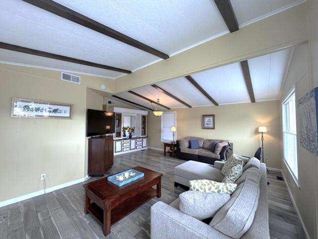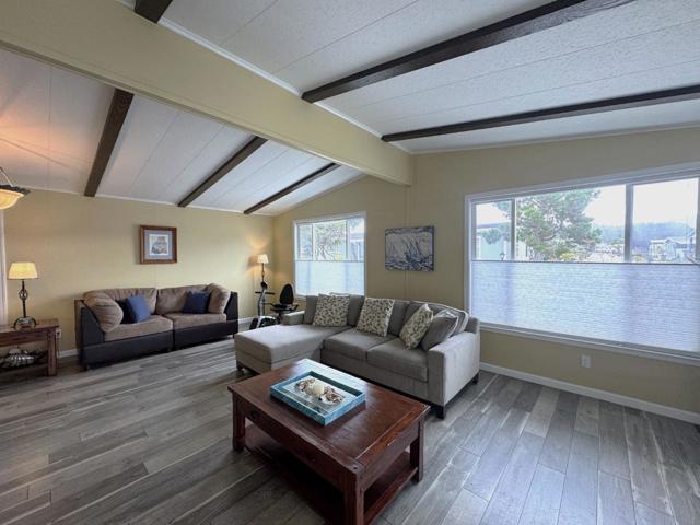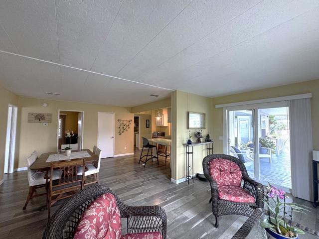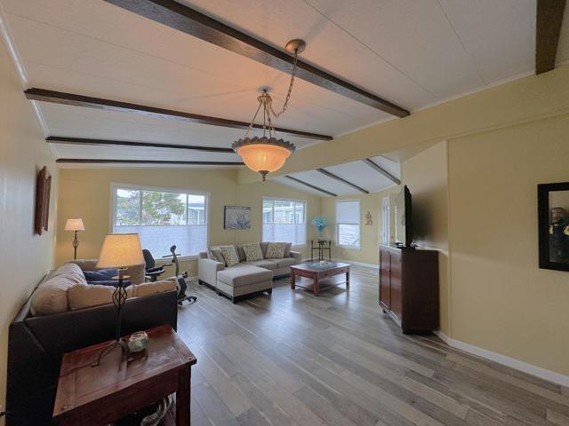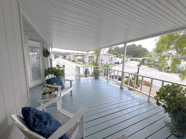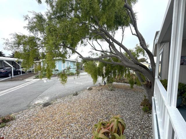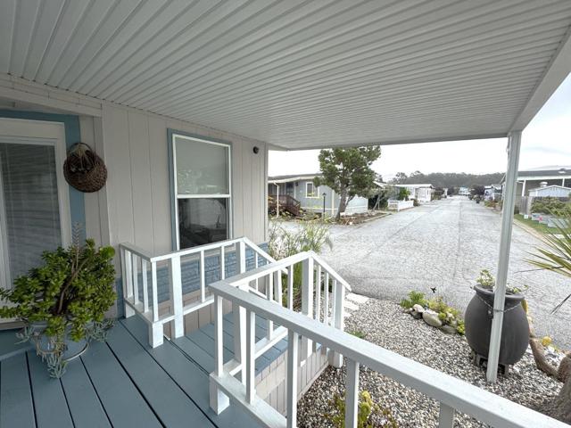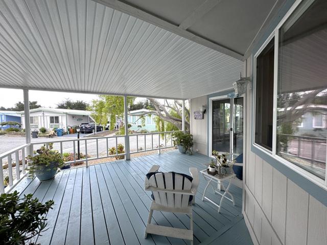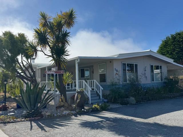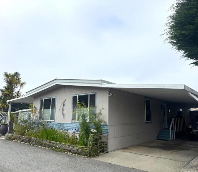 Feast your eyes on this 1650 sq ft, 2-bedroom, 2-bathroom home located in Canada Cove, a 55+ Community in Half Moon Bay. Situated on a large corner lot with an inviting front porch entrance, with shade trees screening for privacy; a place to watch the world go by! A sliding glass door entry leads into the family room and dining area with a wood-burning stove; you know youre at the heart of the house. Well-equipped kitchen featuring a spacious dining bar/peninsula, gas cooktop, built-in oven w/ warming drawer, refrigerator, dishwasher, and pantry cabinet, all framed by an exciting beach/wave epoxy-finish counter/backsplash. Down the hall from the kitchen/dining is a living room that can be used in so many different ways, let your decorating ideas flow; this room has morning light, a built-in cabinet where formal dining can be set up, plus a formal entrance from the front porch. The primary suite with walk-in closet and stylish bathroom that includes a double vanity with hammered copper sinks, and shower. More of the home's amenities: walk-in closets, pass-thru bathroom from 2nd bedroom into laundry (w/d included ), care-free vinyl plank flooring throughout the home and lots of storage tucked here and there; a place for everything! Don't miss the shed in the carport.