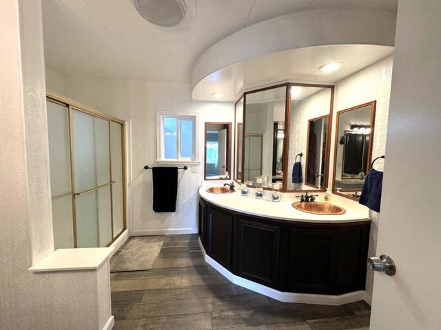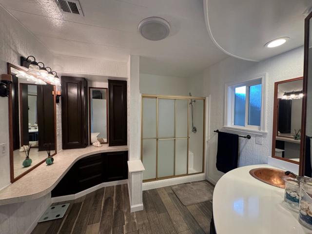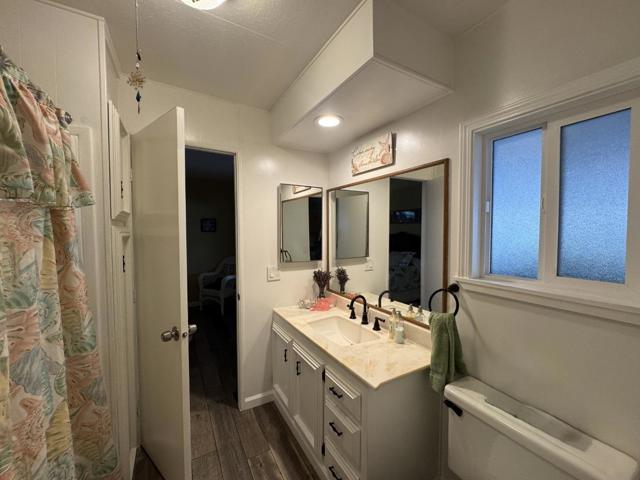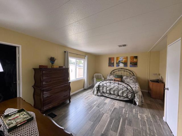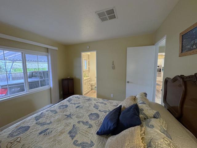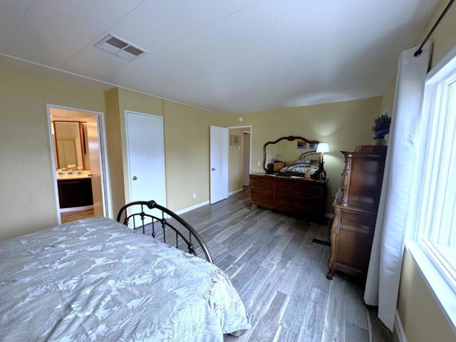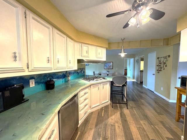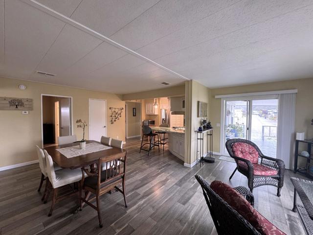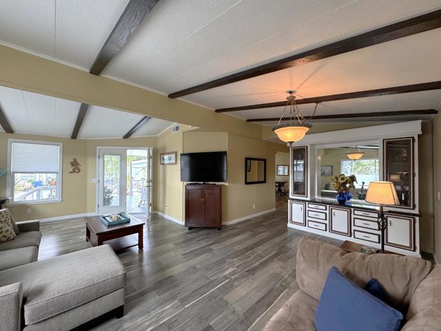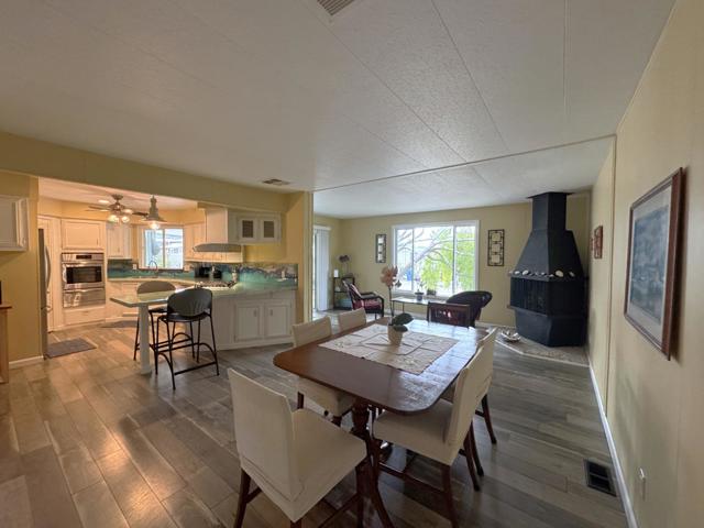 Feast your eyes on this 1650 sq ft, 2-bedroom, 2-bathroom home located in Canada Cove, a 55+ Community in Half Moon Bay. Situated on a large corner lot with an inviting front porch entrance, with shade trees screening for privacy; a place to watch the world go by! A sliding glass door entry leads into the family room and dining area with a wood-burning stove; you know youre at the heart of the house. Well-equipped kitchen featuring a spacious dining bar/peninsula, gas cooktop, built-in oven w/ warming drawer, refrigerator, dishwasher, and pantry cabinet, all framed by an exciting beach/wave epoxy-finish counter/backsplash. Down the hall from the kitchen/dining is a living room that can be used in so many different ways, let your decorating ideas flow; this room has morning light, a built-in cabinet where formal dining can be set up, plus a formal entrance from the front porch. The primary suite with walk-in closet and stylish bathroom that includes a double vanity with hammered copper sinks, and shower. More of the home's amenities: walk-in closets, pass-thru bathroom from 2nd bedroom into laundry (w/d included ), care-free vinyl plank flooring throughout the home and lots of storage tucked here and there; a place for everything! Don't miss the shed in the carport.