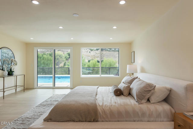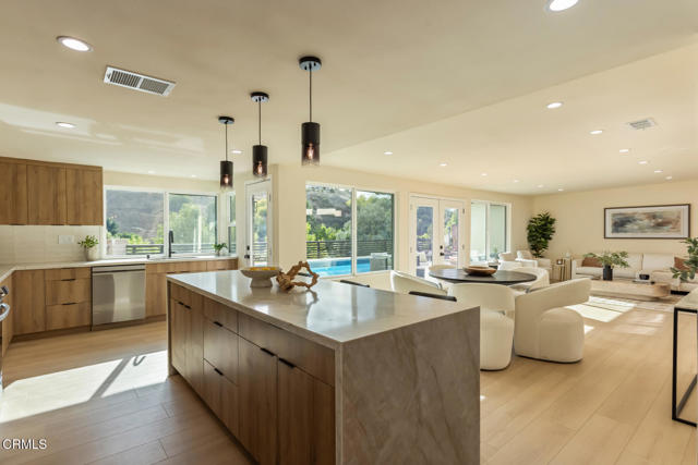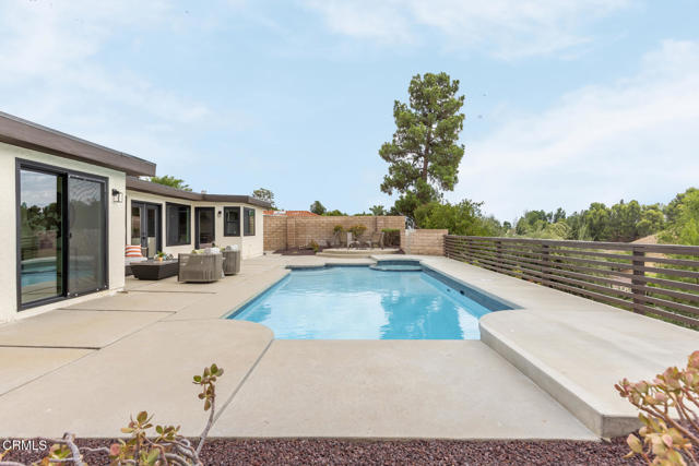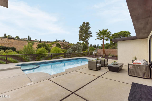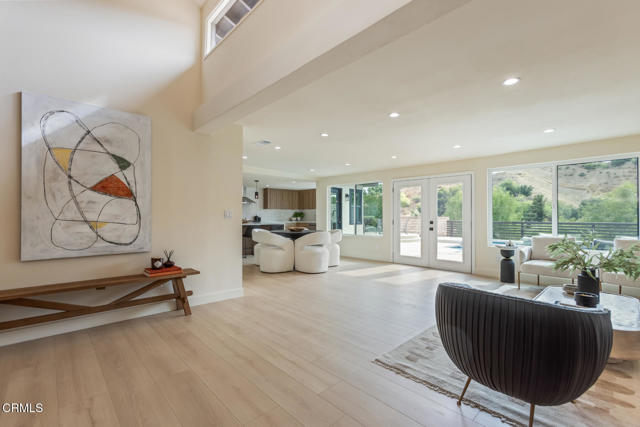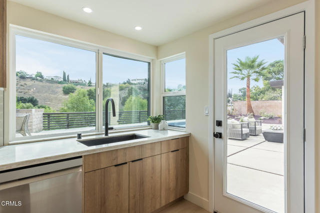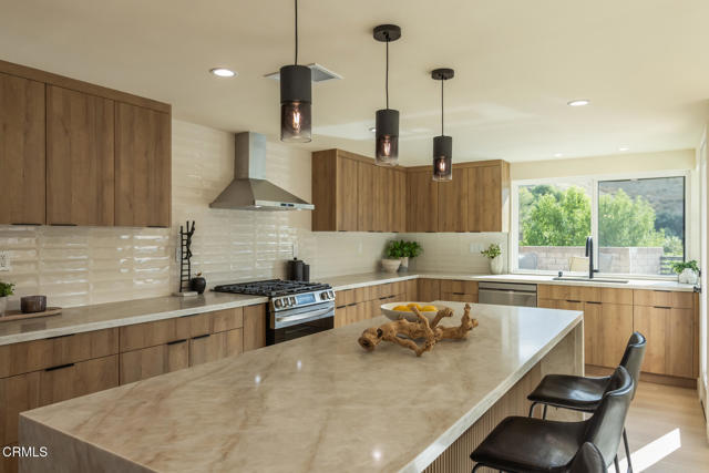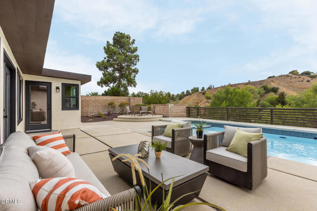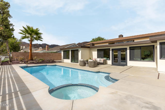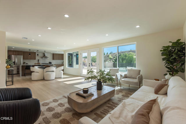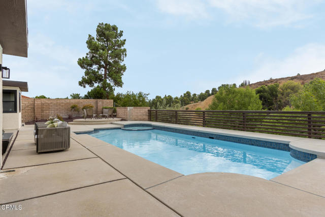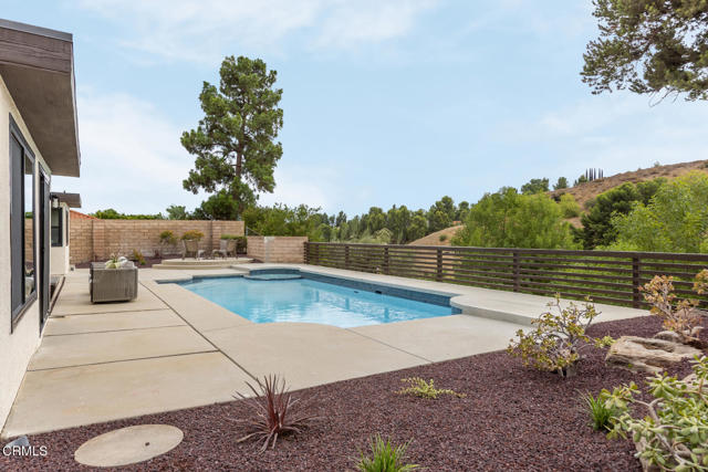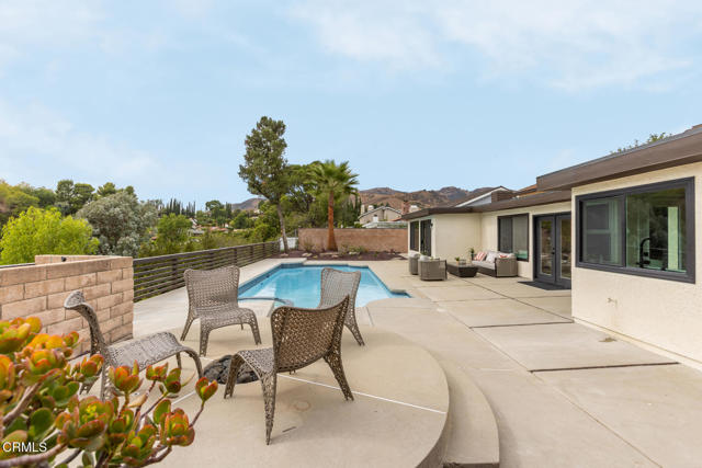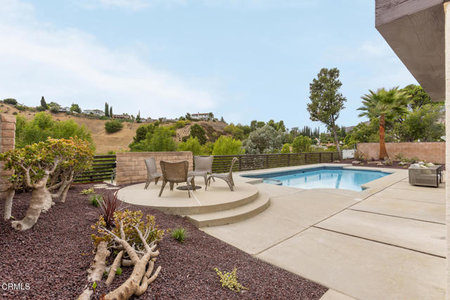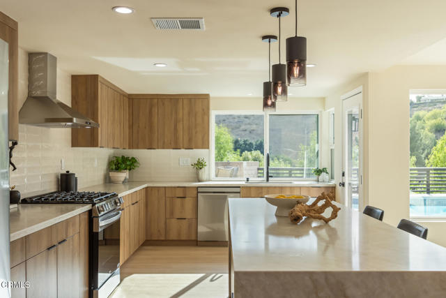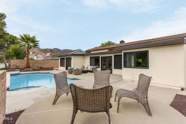 Welcome to this stunning single-story home in the highly desirable Porter Ranch community, offering 3 bedrooms, 2 bathrooms, a sparkling pool and spa, and breathtaking canyon views. Perfectly situated within the award-winning Castlebay Lane Elementary and Granada Hills Charter school districts, the property is just minutes from local parks, hiking trails, The Vineyards at Porter Ranch, and convenient freeway access. Extensively renovated, the home features a brand-new kitchen with modern cabinetry, Taj Mahal quartzite countertops and backsplash, a waterfall island with pendant lighting, state-of-the-art LG appliances, and a built-in bar with beverage/wine refrigerator. Both bathrooms have been beautifully updated with new showers, vanities, toilets, fixtures, and lighting, while the primary suite includes a new soaking tub. Additional upgrades include new laminate flooring throughout, designer-tiled fireplaces in the living room and primary suite, recessed lighting with smart switches, new windows and doors, fresh interior and exterior paint, a new entry and garage door, a new flat roof section, and LG washer and dryer. The backyard is an entertainer's dream with a resurfaced and retiled pool, new pool equipment, upgraded fencing and gates, fresh concrete work, and new landscaping with irrigation. This move-in ready residence combines modern luxury with everyday comfort in one of Porter Ranch's most sought-after neighborhoods.