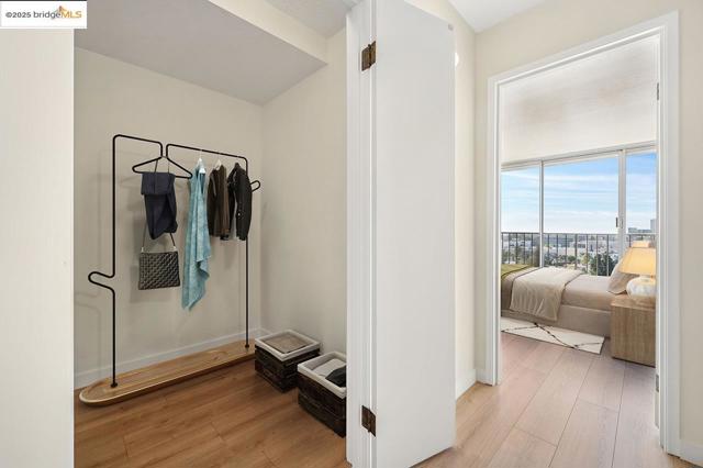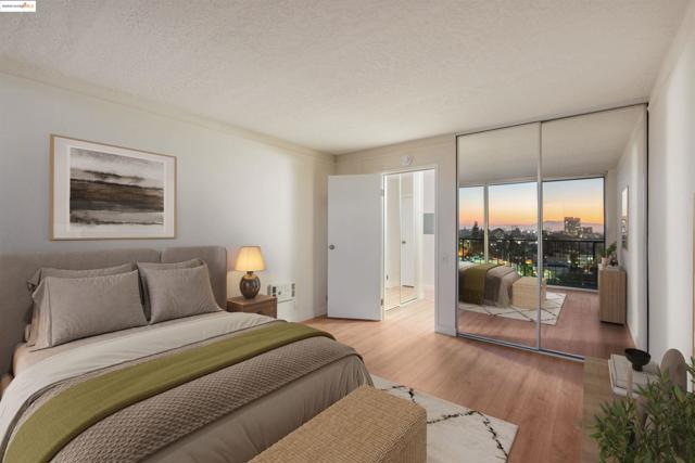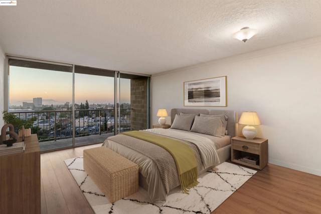 Floor-to-ceiling windows look out over the Bay, Mount Tam, and the city from every room in this west-facing condo. You’ll enjoy the changing light at all hours of the day. At twilight, the city lights twinkle, and the sunsets are spectacular. Enjoy the easy indoor-outdoor flow to a spacious private balcony where you can relax with your morning coffee or evening wine. The open floor plan leads to a sweet kitchen with plenty of counters and cabinets. You’ll find tons of closets, including a huge walk-in closet that could be used as an office. The condo comes with a deeded parking place in a gated garage and a separate storage space. Kelton Court is a highly desirable building, close to transportation, and only three blocks away from the numerous amenities and restaurants on Piedmont Avenue. Enjoy the combination of being close to a vibrant neighborhood, yet live on a tranquil cul-de-sac away from it all. Experience urban living at its best! Views: Downtown