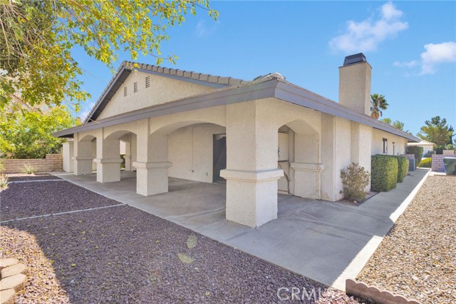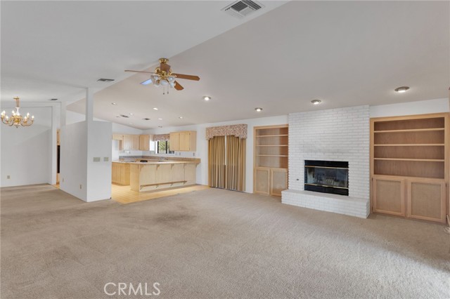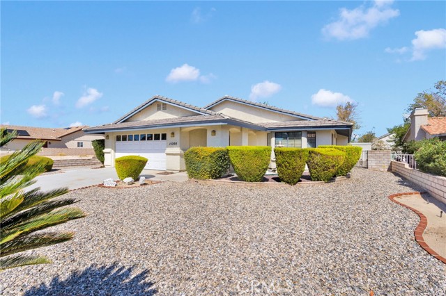 Charming three-bedroom, two-bath home with plenty of space and character! This property features a tile roof, rockscape front yard with no grass, block walls, and a wrought iron gate. Enjoy relaxing mornings on the front porch before stepping inside through the tile entryway. The home offers a two-car garage and thoughtful layout. Bedroom 1, with carpet and built-ins, makes a perfect office or guest space, while Bedroom 2 also has carpet. The primary suite includes carpet, a large mirrored closet, and an ensuite with tiled floors, dual sinks with cultured marble, a small tiled shower, and a sunken tub. The guest bath features a cultured marble shower and tile flooring. The living room is spacious with vaulted ceilings, a beautiful brick fireplace framed by built-ins, and an open connection to the dining area. A large wet bar with sinks makes entertaining easy. The kitchen offers excellent storage with two pantries, plus a center island with electric cooktop, granite countertops, a microwave/oven combo, and a trash compactor—all set on durable laminate flooring. Additional features include a covered patio, backyard shed, and a swamp cooler (currently winterized). This home blends functionality with comfort—ready for your personal touch!