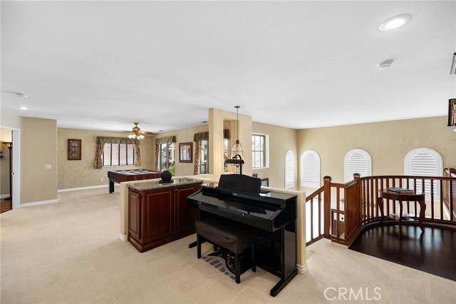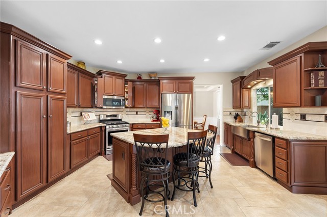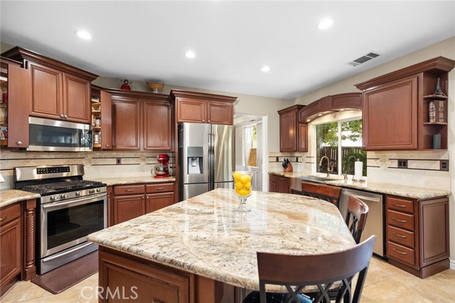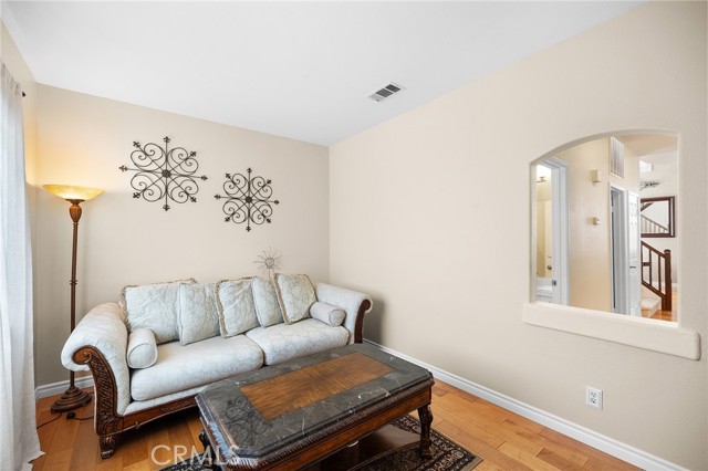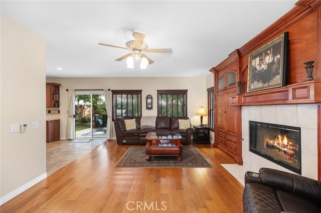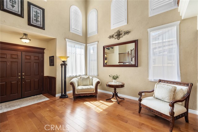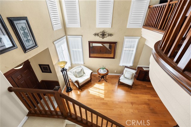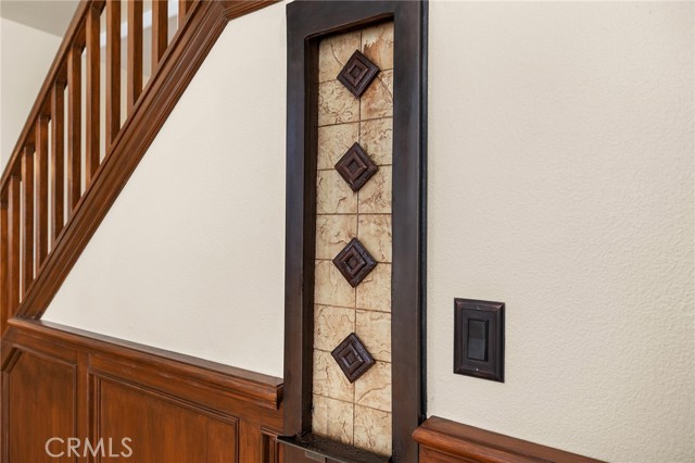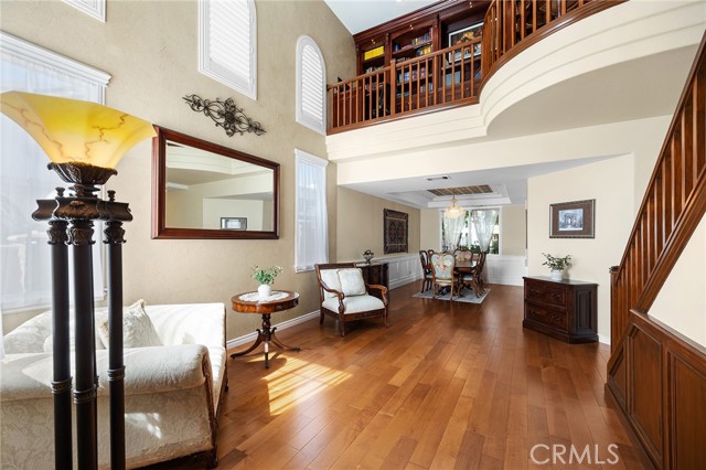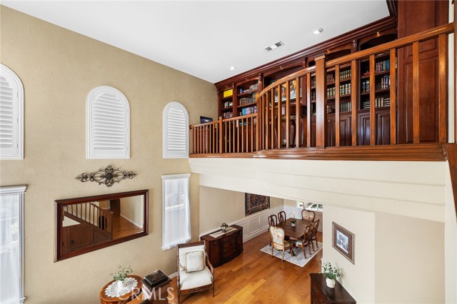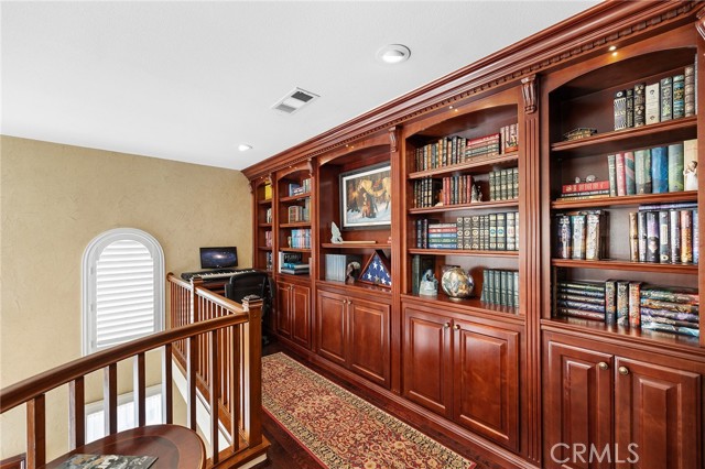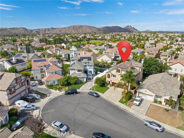 Welcome to this beautifully maintained 4-bedroom, 4-bathroom home with a 3-car garage, tucked away at the end of a quiet cul-de-sac in one of Murrieta’s most peaceful neighborhoods. Lovingly cared for by the original owners, this home blends timeless craftsmanship with thoughtful updates and family-focused comfort. The open living room showcases a stunning two-story Venetian plaster accent wall, tall windows framed with custom woodwork, and a breathtaking $40,000 custom-built second-floor library visible from below. The spacious kitchen features custom cabinetry, granite counters, stainless steel appliances, a Brizo faucet, pull-out spice racks on both sides of the oven and microwave, pull-out storage on both sides of the kitchen sink, a double trash pullout, under-cabinet lighting, and a lighted glass display cabinet. The dining room offers a coffered ceiling and crystal chandelier, while the expansive family room provides flexible space for entertaining or relaxing. Brand new hardwood flooring was installed downstairs in 2023, adding warmth and elegance throughout the main level. The main floor includes a full bathroom and an area that could easily be converted into a bedroom, ideal for guests or multi-generational living. Upstairs, the impressive primary suite spans the entire width of the home, offering space for a sitting area, gym, or office, and features a generous ensuite with dual sinks, a large soaking tub, and a spacious walk-in closet. The large bonus room includes access to a private balcony perfect for morning coffee or evening sunsets, while the third floor serves as a versatile retreat for creativity, recreation, or movie nights with a large projection wall. Enjoy the private enclosed flagstone courtyard with a split-faced stone wall, built-in fountain, timer-controlled lighting, and custom wrought-iron gates at both the courtyard and side entry. The backyard offers a gas BBQ hookup, mature trees, and lush landscaping for a peaceful outdoor retreat. Each floor has its own dedicated A/C unit for comfort and efficiency. Additional highlights include updated plumbing and electrical with 20-amp outlets in the garage and exterior, a very low-payment solar lease, plenty of storage throughout, and no HOA. Close to parks, top schools, and Temecula Wine Country, this home perfectly balances elegance, warmth, and everyday family living.