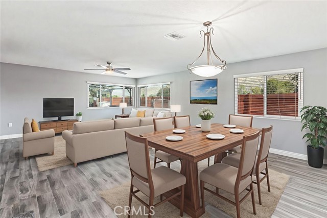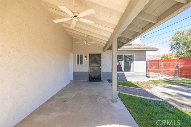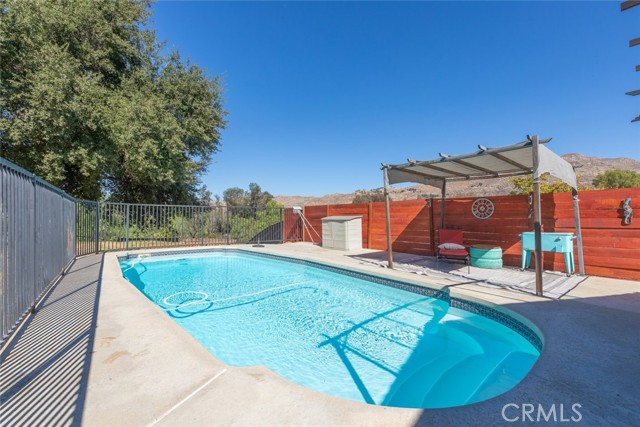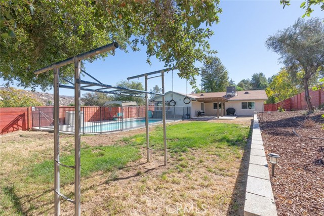 Welcome to your own private retreat—this charming ranch-style pool home sits on a spacious lot with sweeping views of the San Jacinto Valley and surrounding mountains. Freshly updated inside and out, the property features new dual-pane windows, new carpet, fresh interior and exterior paint, and a new electric front gate for added convenience and security. Step inside through a covered arched patio and into a warm, inviting living area complete with a wood-burning fireplace, perfect for cozy evenings. The kitchen opens seamlessly to a spacious family room where you can entertain guests or relax while overlooking the sparkling in-ground pool and scenic backyard. The kitchen comes equipped with stainless steel appliances, under-cabinet lighting, and ample counter space. The primary suite features French doors, a walk-in closet, and a private bath. Two additional bedrooms offer comfort and natural light. Outside, you’ll find an expansive backyard with mature shade and fruit trees, plenty of room for gatherings, gardening, or even a future small horse setup or additional structure. The newly added backyard patio enhances outdoor living, while the two-car garage delivers abundant storage and workspace. A detached front office provides versatile options for work, hobbies. Nestled at the end of a peaceful cul-de-sac, this home offers a sense of country living while still being just minutes from Diamond Valley Lake, Valley-Wide Park, and local amenities. Move-in ready and full of charm—don’t miss your chance to own this beautiful, upgraded ranch home! Home has been virtually staged to show potential.