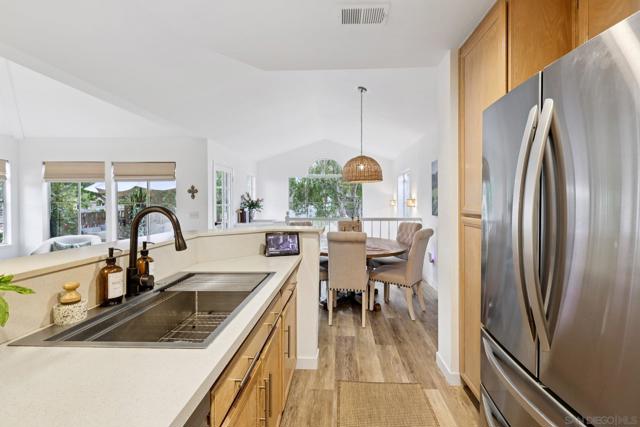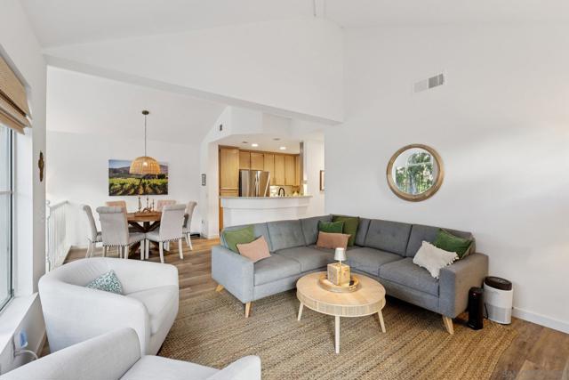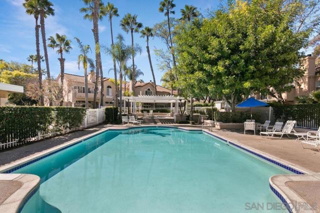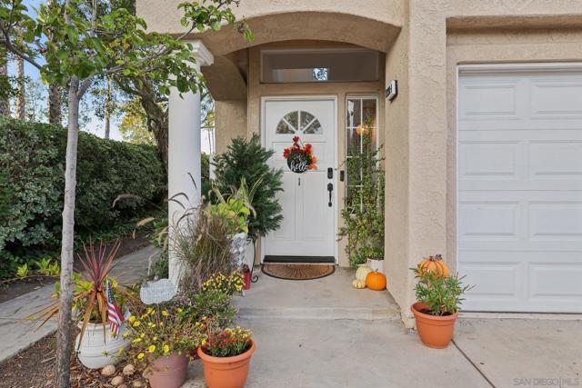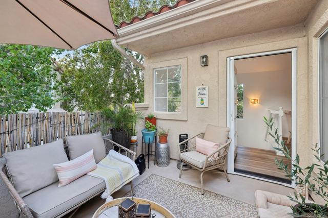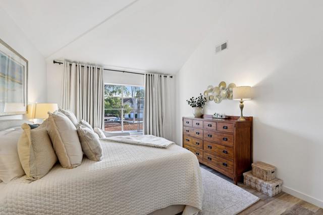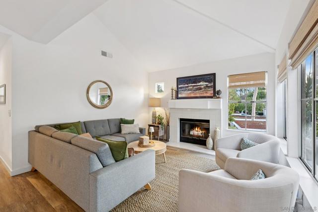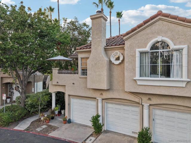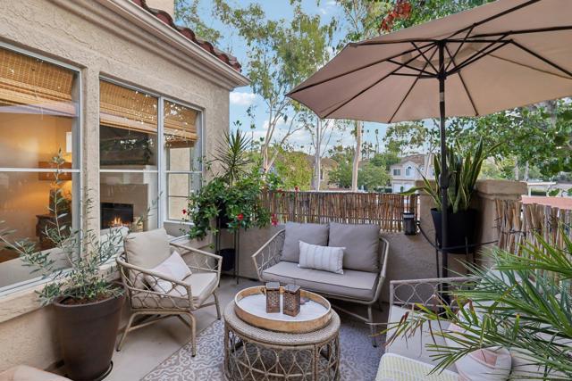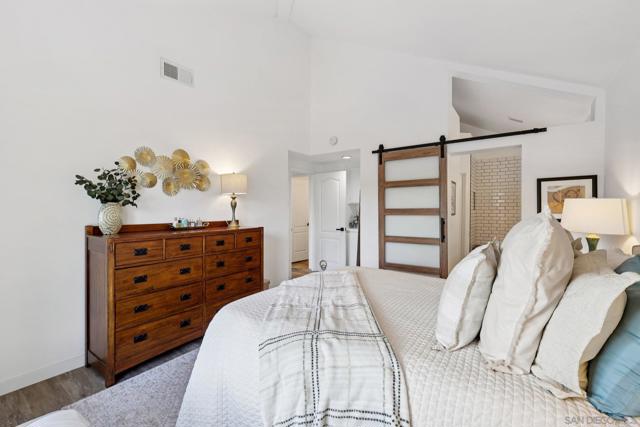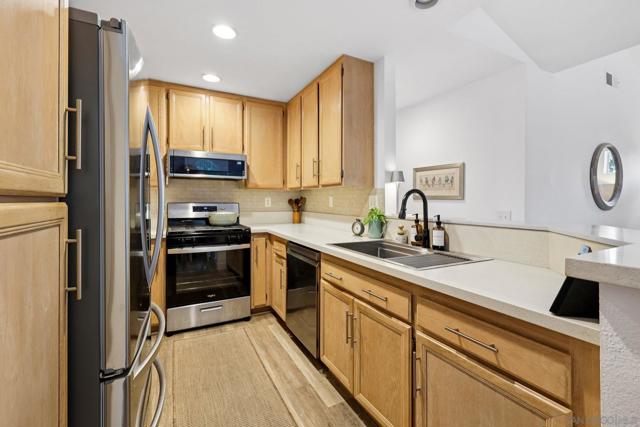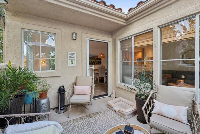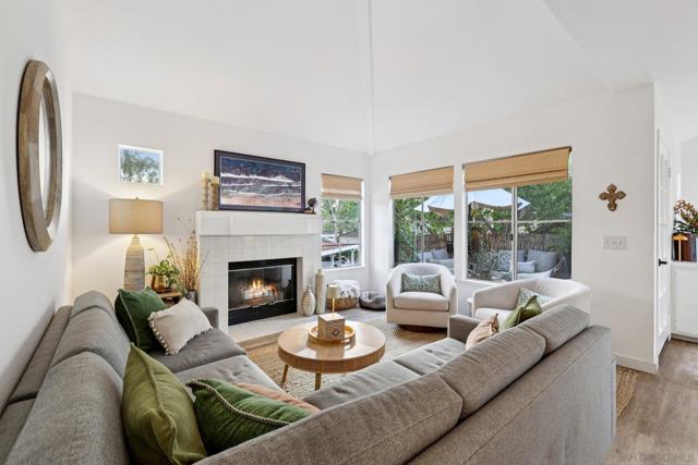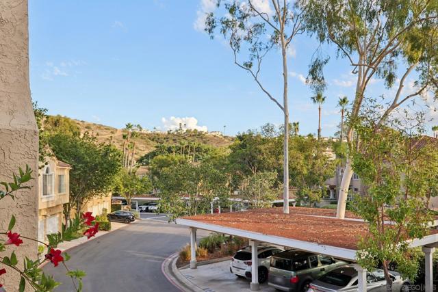 STUNNING BELSERA CONDO – PRIME LOCATION NEAR MISSION TRAILS PRESERVE – LARGE BALCONY – GARAGE WITH DIRECT ACCESS TO HOME AND CARPORT PARKING! Welcome to this beautifully upgraded and freshly remodeled upper-level 2-bedroom, 2-bath home in the highly desirable Belsera community, located just steps from Mission Trails Preserve. Bright, spacious, and designed for modern living, this home combines elegant finishes, smart features, and everyday comfort. The open-concept layout features vaulted ceilings and expansive windows that fill the home with natural light, creating a bright and airy feel. The living room features a cozy gas fireplace with Birch wood logs and a $1,600 Samsung Frame TV, along with custom bamboo window treatments. The large second-story balcony offers the perfect space to relax and take in the peaceful surroundings. The kitchen is beautiful, featuring wood-finish cabinets, quartz countertops, a deep stainless steel chef’s sink with a bronze faucet, a low-profile vented microwave, custom lighting, and an LG refrigerator with a double pull-out freezer. The pull-out pantry shelves and abundant cabinetry make storage effortless. The spacious primary suite features vaulted ceilings and a sliding barn door that opens to a luxurious ensuite bathroom with a double vanity, a beautiful walk-in custom-tiled shower, and a large walk-in closet. Both bathrooms have been stylishly updated with modern fixtures and finishes. Additional features include a Blink camera doorbell with a smart DESLOC front lock that opens via fingerprint, code, fob, or Bluetooth. The attached garage with direct access to your home is fully finished with epoxy floors, mounted LG TV, overhead storage, and a stackable LG washer and dryer. The house also includes bronze hardware throughout, adding to the elevated designer feel. Recent upgrades include a new HVAC system, a new water heater, and new kitchen appliances. The elegant, warm oak LVP flooring ties everything together, creating a cohesive, sophisticated look. Belsera offers resort-style amenities, including two pools, spas, BBQ areas, volleyball courts, walking trails, and lush, park-like landscaping. Enjoy a lifestyle that blends tranquility and convenience—just minutes from freeways, schools, shopping, restaurants, and parks. This stunning home is San Diego living at its finest—modern, functional, and completely move-in ready. Conveys: 2 mounted TVs (Samsung Frame TV in the living room and LG TV in the garage. LG stackable washer and dryer, all kitchen appliances, all window covers, Camera doorbell, and smart door lock.