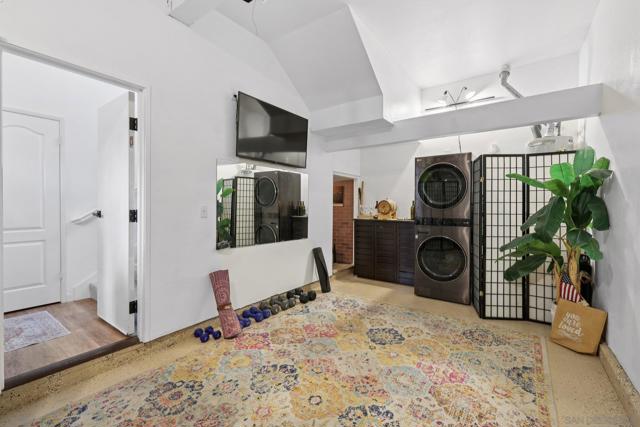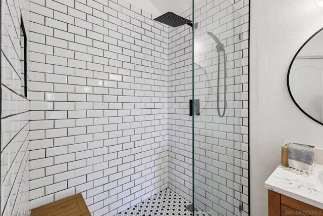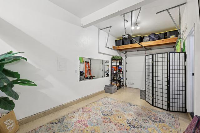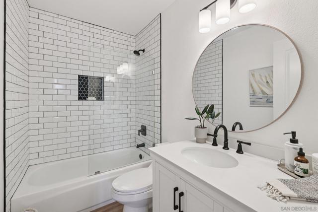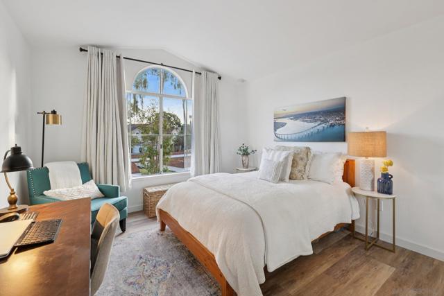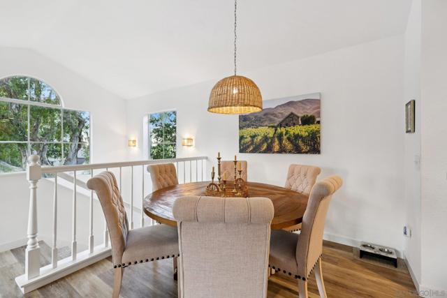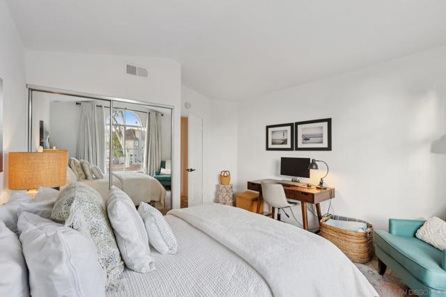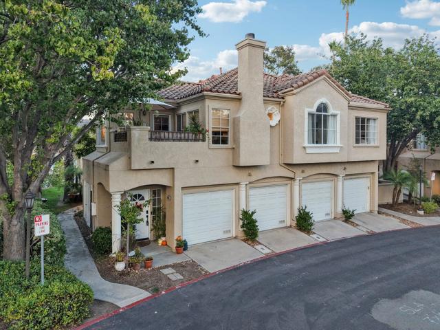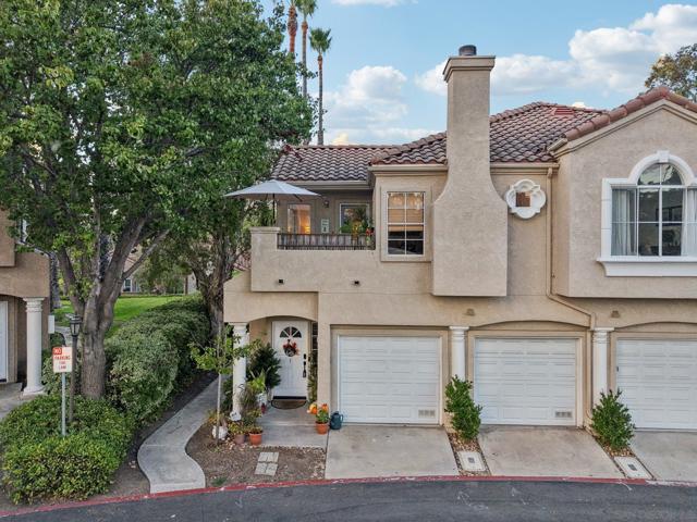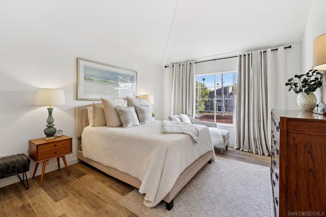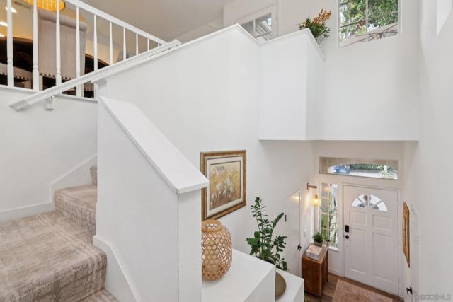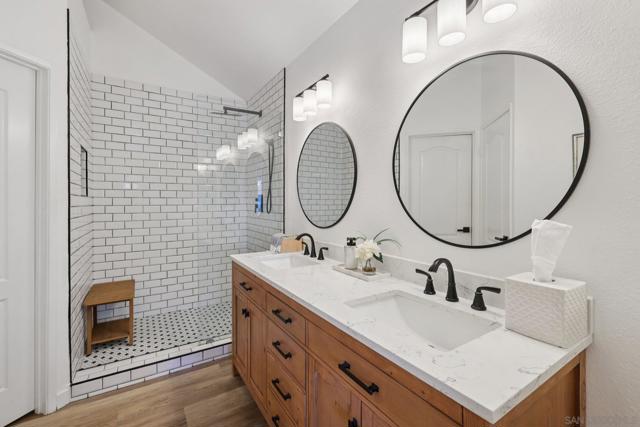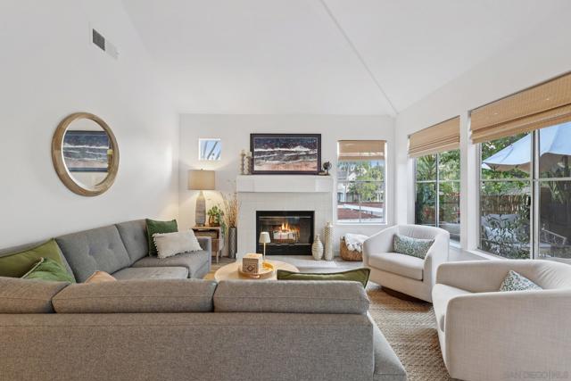 STUNNING BELSERA CONDO – PRIME LOCATION NEAR MISSION TRAILS PRESERVE – LARGE BALCONY – GARAGE WITH DIRECT ACCESS TO HOME AND CARPORT PARKING! Welcome to this beautifully upgraded and freshly remodeled upper-level 2-bedroom, 2-bath home in the highly desirable Belsera community, located just steps from Mission Trails Preserve. Bright, spacious, and designed for modern living, this home combines elegant finishes, smart features, and everyday comfort. The open-concept layout features vaulted ceilings and expansive windows that fill the home with natural light, creating a bright and airy feel. The living room features a cozy gas fireplace with Birch wood logs and a $1,600 Samsung Frame TV, along with custom bamboo window treatments. The large second-story balcony offers the perfect space to relax and take in the peaceful surroundings. The kitchen is beautiful, featuring wood-finish cabinets, quartz countertops, a deep stainless steel chef’s sink with a bronze faucet, a low-profile vented microwave, custom lighting, and an LG refrigerator with a double pull-out freezer. The pull-out pantry shelves and abundant cabinetry make storage effortless. The spacious primary suite features vaulted ceilings and a sliding barn door that opens to a luxurious ensuite bathroom with a double vanity, a beautiful walk-in custom-tiled shower, and a large walk-in closet. Both bathrooms have been stylishly updated with modern fixtures and finishes. Additional features include a Blink camera doorbell with a smart DESLOC front lock that opens via fingerprint, code, fob, or Bluetooth. The attached garage with direct access to your home is fully finished with epoxy floors, mounted LG TV, overhead storage, and a stackable LG washer and dryer. The house also includes bronze hardware throughout, adding to the elevated designer feel. Recent upgrades include a new HVAC system, a new water heater, and new kitchen appliances. The elegant, warm oak LVP flooring ties everything together, creating a cohesive, sophisticated look. Belsera offers resort-style amenities, including two pools, spas, BBQ areas, volleyball courts, walking trails, and lush, park-like landscaping. Enjoy a lifestyle that blends tranquility and convenience—just minutes from freeways, schools, shopping, restaurants, and parks. This stunning home is San Diego living at its finest—modern, functional, and completely move-in ready. Conveys: 2 mounted TVs (Samsung Frame TV in the living room and LG TV in the garage. LG stackable washer and dryer, all kitchen appliances, all window covers, Camera doorbell, and smart door lock.