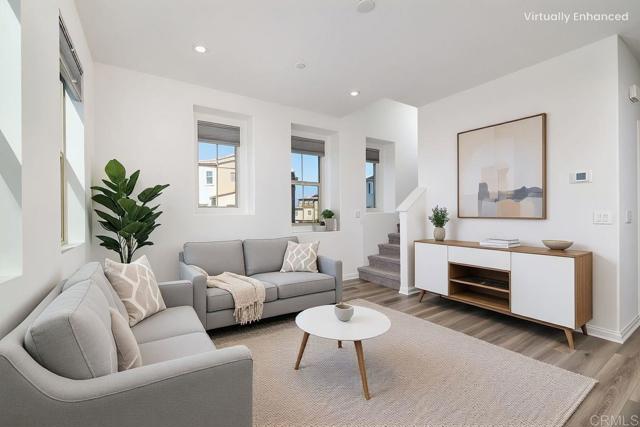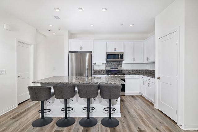 Welcome to Sunset at Melrose Heights — Oceanside’s modern community designed for easy living and everyday comfort. This stylish 2-bed, 2-bath end-unit condo, built in 2023, offers bright, open spaces and over $25,000 in builder upgrades, including PAID solar! Step inside to an open-concept floor plan with upgraded flooring, added recessed lighting throughout, and granite countertops. The kitchen features a stainless-steel farmhouse sink, Samsung stainless appliances, and a center island with bar seating and four matching stools — perfect for casual dining or entertaining. 3 ceiling electrical junction boxes for pendant lighting over the kitchen island should you want to put your own flair on it. The primary suite offers a walk-in closet, dual-sink vanity, and a spacious walk-in shower. Every window includes pull-down blinds for added privacy. Enjoy the outdoors on your private balcony — ideal for golden hour sunsets or a weekend BBQ with friends — and take advantage of the attached 2-car garage with extra storage space. With paid solar to keep energy costs low and community amenities including a pool and kid tot lots, Melrose Heights delivers modern comfort, low-maintenance living, coastal convenience and a prime location near shopping, freeways, and beautiful beaches — all at an affordable price. Advertising disclosure - some photos have been virtually staged and enhanced.