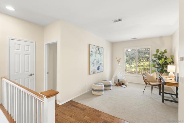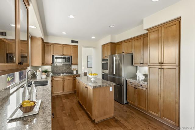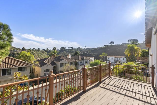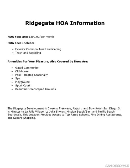 Welcome to this meticulous four-bedroom home located just four streets from the top in the highly desirable gated Ridgegate community in La Jolla. This inviting Meridian floorplan offers expansive living spaces. Enjoy the living and dining great room with soaring 20+ft ceilings and abundance of windows that create a warm, open atmosphere perfect for entertaining. Beautiful brand new hardwood floors throughout the downstairs area. The spacious kitchen features a center island, new Bosch refrigerator and new gas cooktop. You’ll enjoy how the kitchen flows seamlessly into the breakfast area and family room with fireplace. The generous primary suite boasts high ceilings and has a private outdoor deck with canyon/mountain views. The backyard is ideal for outdoor living, complete with a built-in BBQ, mini fridge, and sink. Other features include air conditioning, high end HEPA filter and a three-car garage. Residents of Ridgegate La Jolla enjoy exceptional community amenities including a pool, spa, clubhouse, sport court, and playground. Conveniently located minutes to La Jolla Village, La Jolla Cove, La Jolla Shores, Pacific Beach, Mission Beach/Bay, top-rated schools, restaurants, shopping and more.
