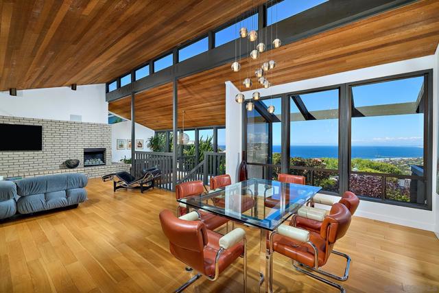 Perched above La Jolla Shores with sweeping 270-degree views, this striking architectural home celebrates form, light, and the beauty of its natural surroundings. Thoughtfully redesigned with a focus on modern livability, the residence balances mid-century inspiration with contemporary refinement. A reverse floor plan maximizes the breathtaking coastal panorama—from the distant mountains of East County to the shimmering Pacific Ocean. Walls of glass, exposed beams, and vaulted cedar ceilings flood the interiors with warmth and light, blurring the boundaries between indoors and out. The reimagined kitchen offers a refined minimalist aesthetic with flat-panel European-style cabinetry, open shelving, and sleek quartz countertops—perfectly aligned with the home’s architectural vision. Each bathroom has been artfully renewed with a serene, spa-like design that emphasizes natural textures and clean lines. An inviting gated courtyard sets the tone for what lies within, opening to a dramatic glass pivot entry and open-riser staircase that frames ocean views beyond. Modern updates include a new standing seam metal roof (2024), epoxy-coated garage floors, a newer HVAC system (2023), and owned solar—ensuring both comfort and sustainability. Set on a secluded .51-acre lot, the grounds are a living work of art—lushly landscaped with sculptural plantings, mature pines, and layered greenery that provide total privacy. The pool and surrounding gardens create an intimate outdoor retreat just moments from La Jolla Shores Beach, world-class dining, and the village. A rare harmony of architecture, landscape, and light—**2551 Via Viesta** is a private coastal sanctuary that captures the essence of La Jolla living.